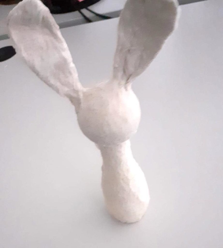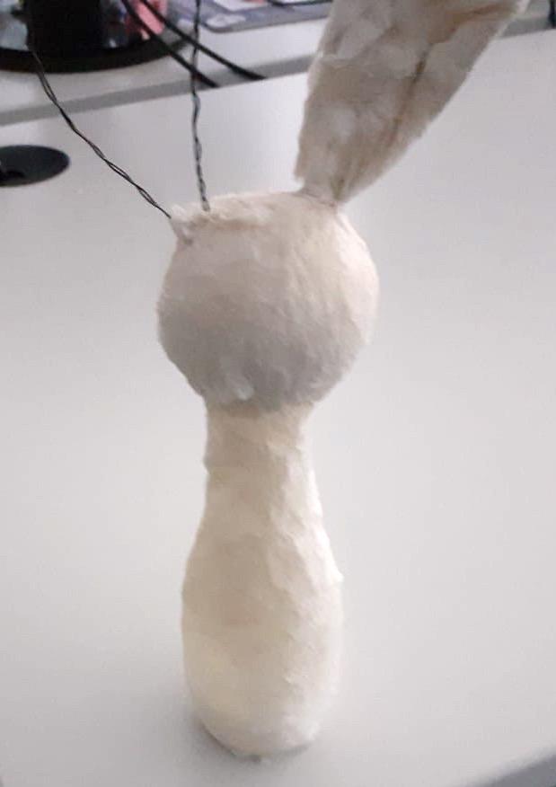 Jetzt geht es an das Bekleben! Wenn du Toilettenpapier nimmst, reißt du ca. 30 Blätter einzeln ab. Flasche, Kugel und Draht werden jetzt mit Wasser angefeuchtet und die Papier werden schichtweise aufgelegt. Nach 4-5 Schichten – zwischendurch immer wieder anfeuchten – ist der Hase im Rohzustand fertig!