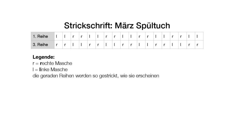 Dann strickst du nach der Strickschrift für das März Spültuch beginnend mit * 2 Maschen links, 2 Maschen rechts* im Wechsel bis die Reihe beendet ist. Die Rückreihe strickst du so, wie die Maschen erscheinen.