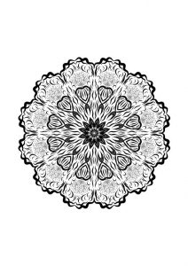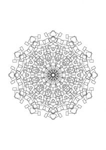Dieses Mandala besteht komplett aus Rechtecken, die sich überschneiden und überlappen, was aber nicht die Komplexität mindert. Auch hier gibt es viele kleine Flächen die aber, wenn komplett ausgemalt, ein tolles Muster ergeben.