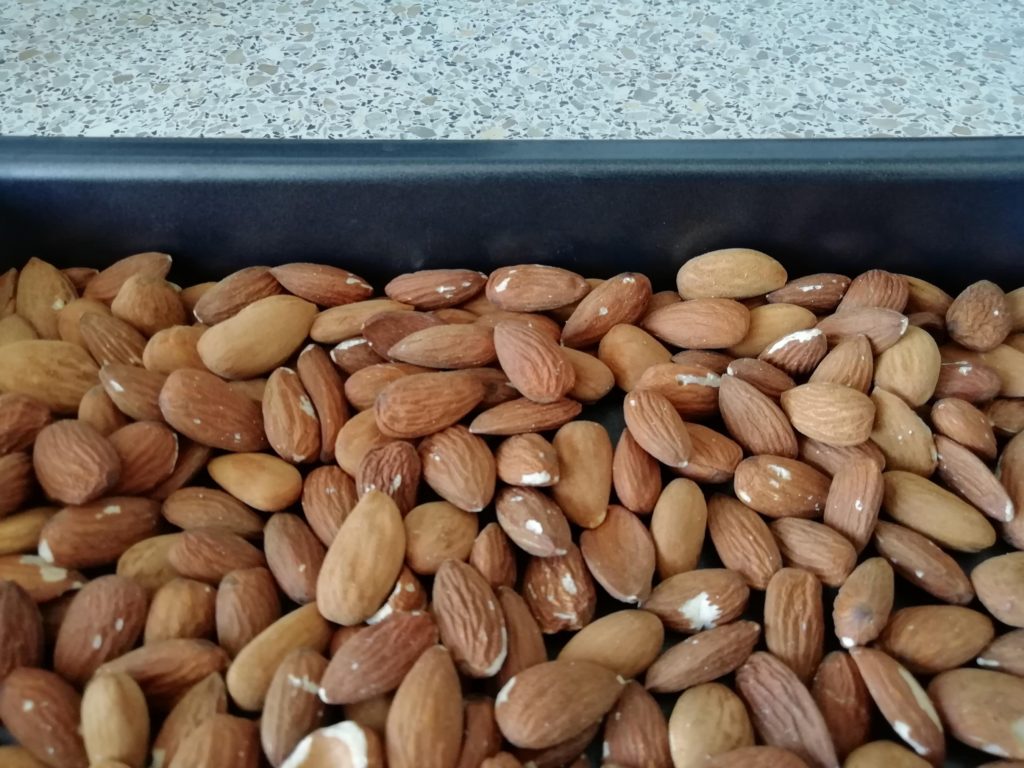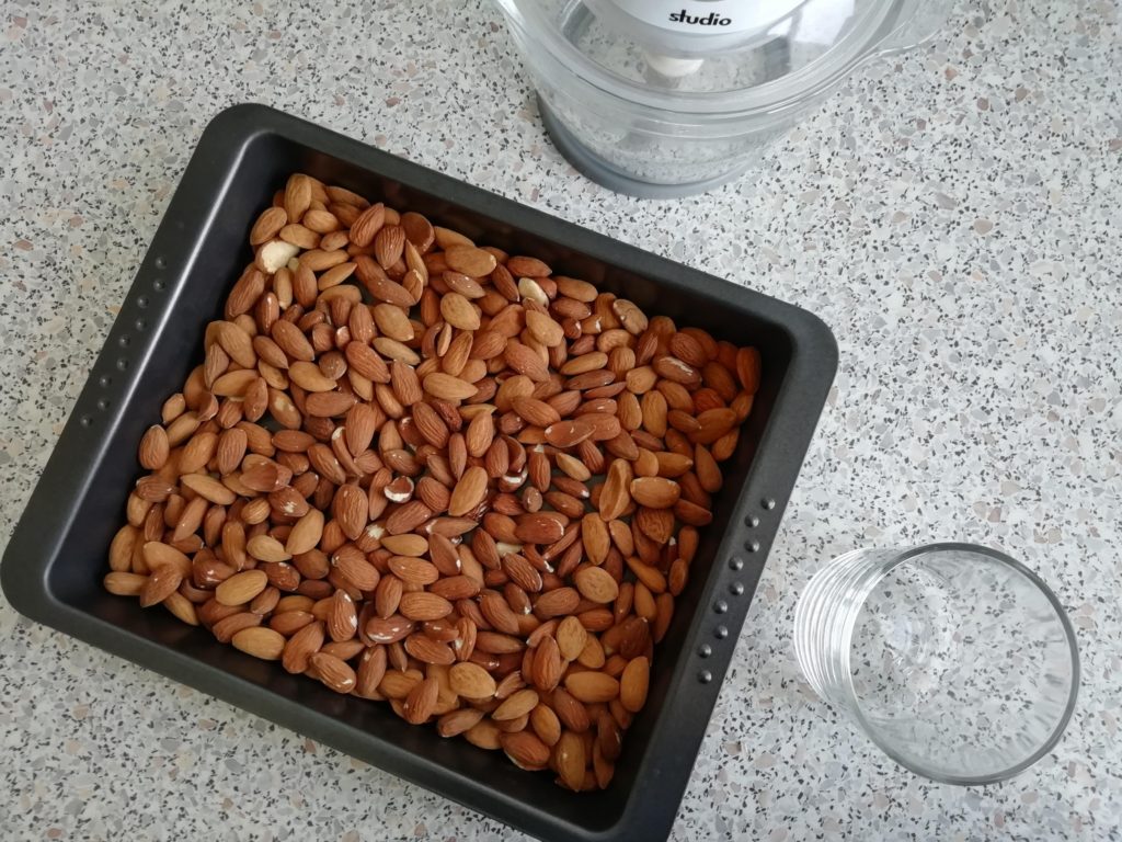 Zunächst heizt ihr euren Ofen auf 180° Umluft vor. Verteilt die Mandeln auf einem Backblech und röstet sie im Ofen für ca. 10 bis 15 Minuten, bis sie gut duften. Holt sie danach aus dem Ofen und lass sie abkühlen, bis sie kalt oder lauwarm sind.