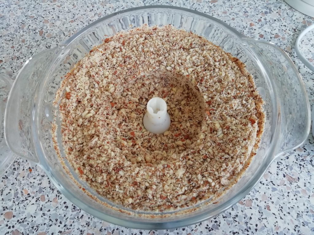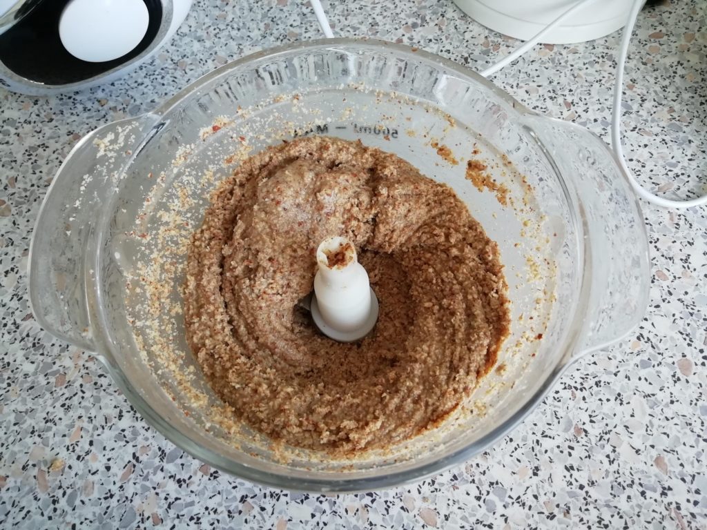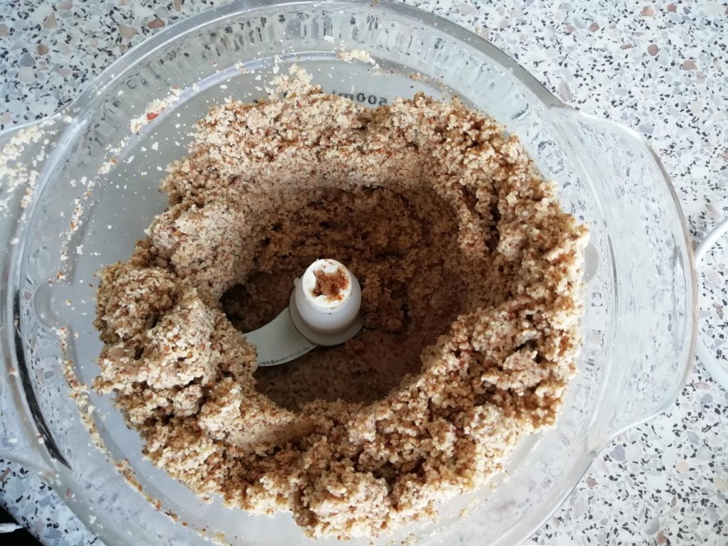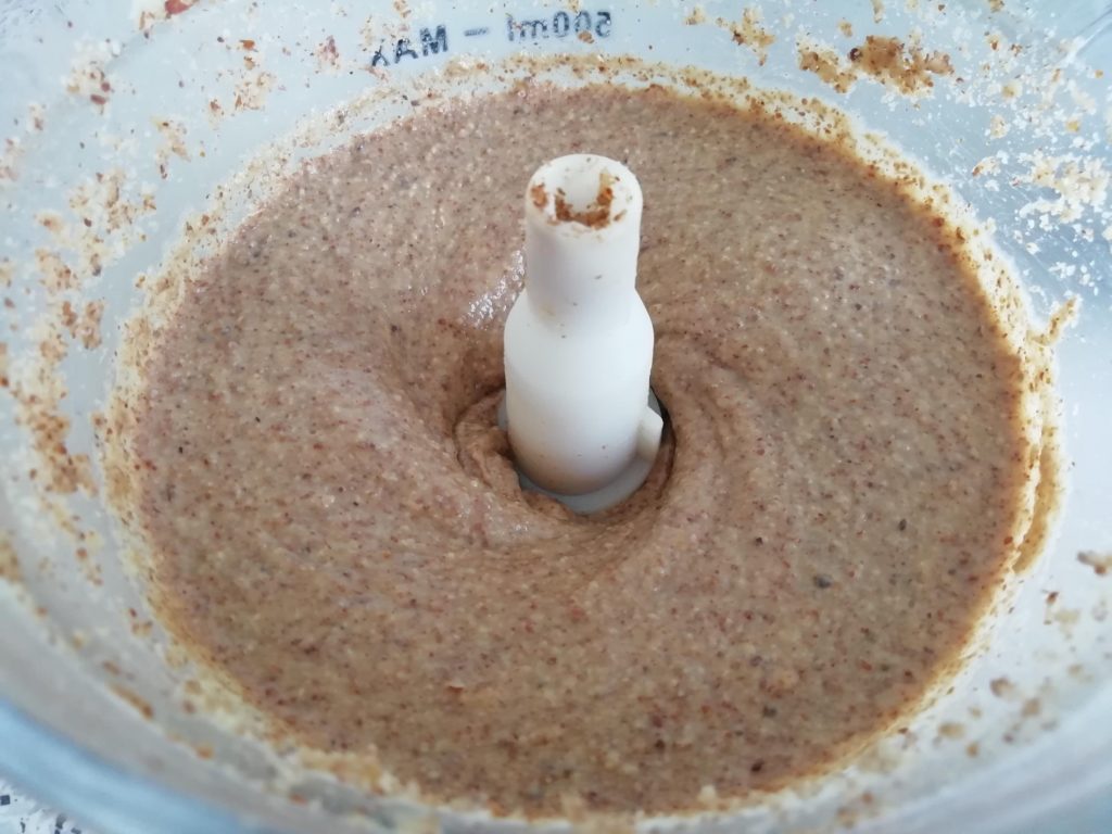 Macht so weiter wie vorher auch. Beim Mixen ist Geduld angesagt, denn die Mandeln müssen erst ihre Öle freisetzen. Das geschieht Stück für Stück: erst werdet ihr merken, dass sich im Mehl immer mehr Klumpen bilden, dann wird das Ganze eine festere Masse.