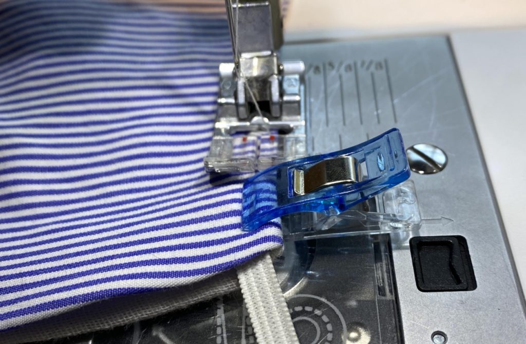 Jetzt bügelst du die schmalen Seiten der Nahtzugabe nach innen. Du legst ein Ende vom Gummiband, alternativ das Schrägband, ca. 1 cm zwischen den oberen und den unteren Stoff an die obere Kante und nähst das Band gut fest. Das andere Ende vom Gummiband nähst du genauso an die untere Kante von der Mund-Nasenmaske. Das Gummiband für die Kinder-Mund-Nasenmasken bitte entsprechend anpassen.