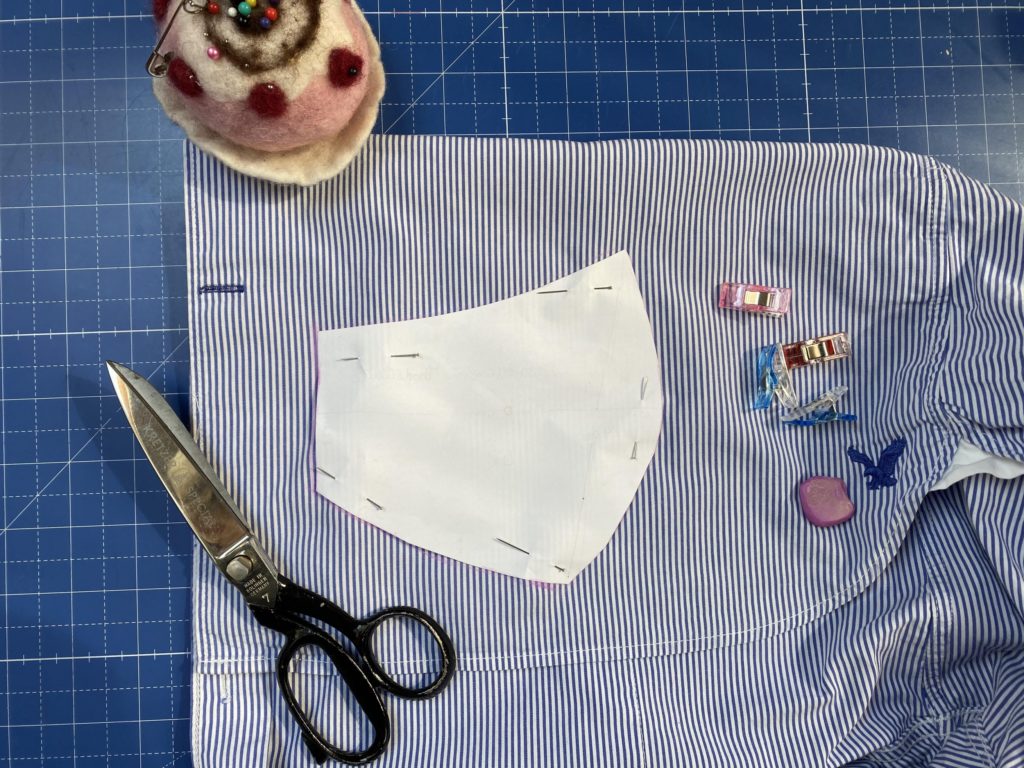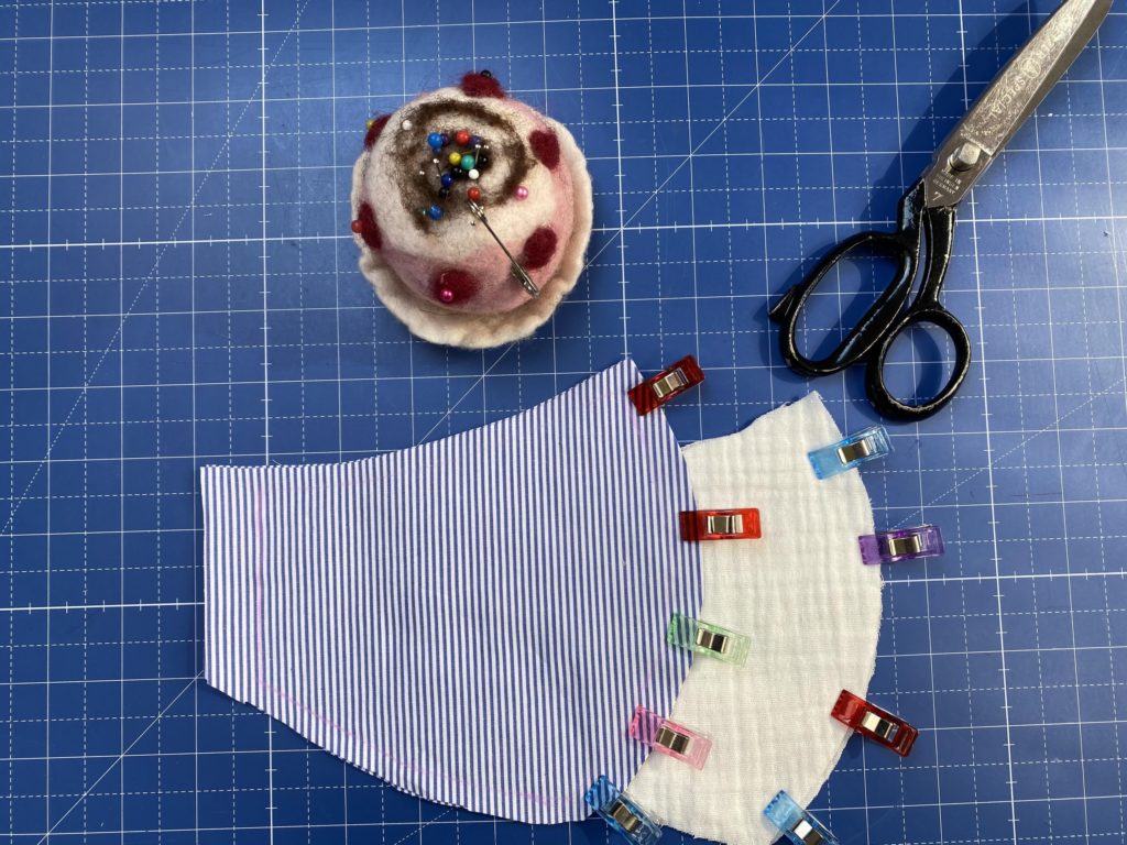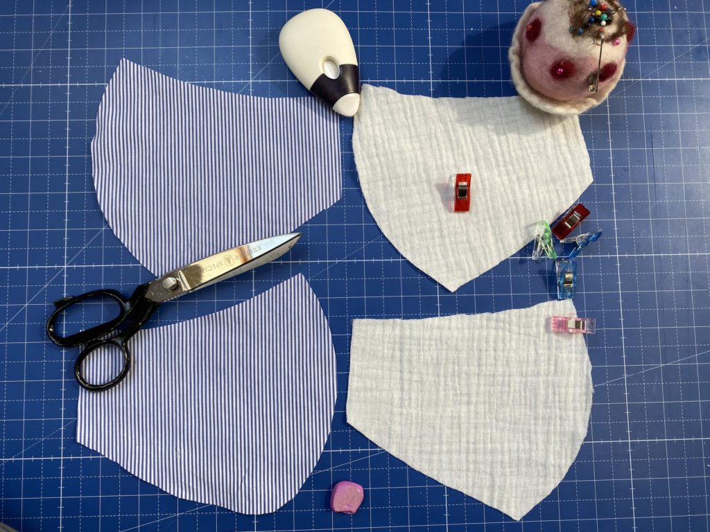 Als erstes schneidest du den Stoff zu. Bitte beachte, dass du eine rechte und eine linke Seite zuschneidest. D.h., du musst die Vorlage einmal mit der Schrift nach oben und einmal mit der Schrift nach unten zuschneiden. Das ist vor allem für den Oberstoff wichtig! Oder du schneidest die Mund-Nasenmaske im Stoffbruch zu.