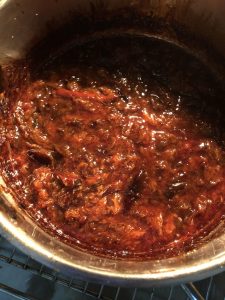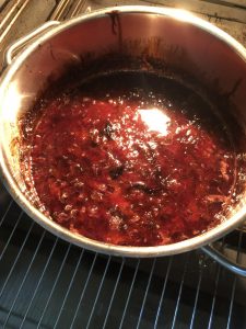 Ich habe erst mit einem normalen Backblech angefangen und die Pflaumenmischung später in einen großen Topf umgefüllt (nachdem der Backofen schon ein bisschen eingesaut war ;-c)