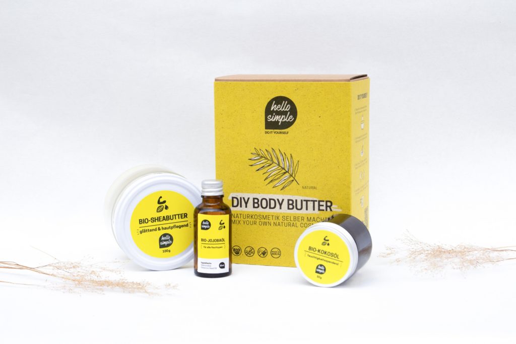 Zum einem im Paket enthalten ist die DIY-Box Vegane Body Butter von Hello Simple. Diese, wie auch alle anderen Produkte, besteht ausschließlich aus Bio-Zutaten. Die Body Butter sorgt dafür, dass die Haut nicht mehr austrocknet und dazu auch noch extrem lecker riecht!