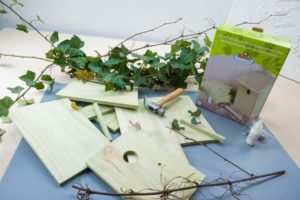 Der Nistkasten-Bausatz besteht aus 9 Teilen, die zusammengebaut werden müssen. Hammer, Leim und Nägel sind auch dabei. Ihr könnt also direkt anfangen!