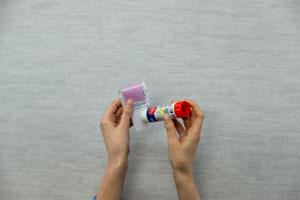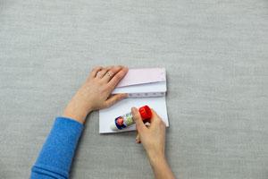 Nehmt ein Ritter Sport Mini Täfelchen und legt einen ausgeschnittenen Gutschein darauf. Wickelt den Gutschein um das Schokoladentäfelchen und fixiert ihn mit einem Klebestift oder Klebeband. Wiederholt diesen Schritt für alle Schokoladen.