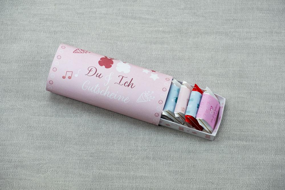 Zum Schluss könnt ihr die Ritter Sport Schachtel mit den „Du & Ich“ Gutscheinen verzieren. Dafür klebt ihr einfach einen breiteren Gutschein oder ein gestaltetes Papier, das mit „Du & Ich Gutscheine“ beschriftet ist, um die Umverpackung. Achtet darauf, dass die Verpackung vollständig umschlossen und der Schriftzug gut sichtbar ist. Verschließt die Banderole hinten mit Klebestift oder Klebeband.