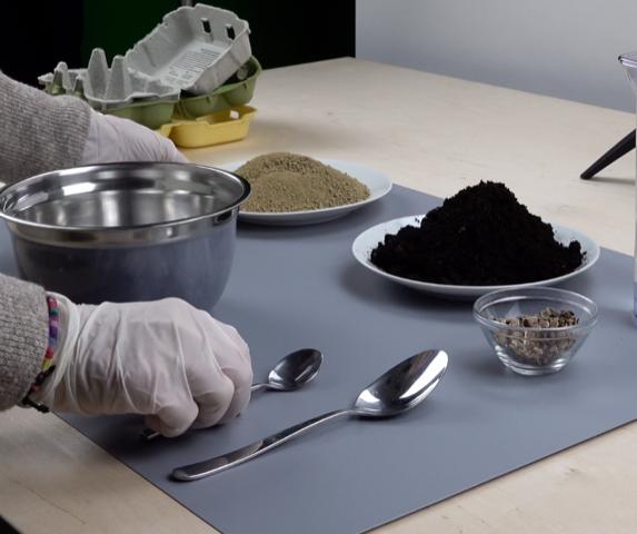 Du mischt die Erde, das Katzenstreu und die Blumensamen erst einmal im trockenen Zustand. Achte darauf, dass du so ganz feste Elemente entfernst. Wenn alles gut vermischt ist fügst du langsam Wasser hinzu und verrührst alles, bis ein geschmeidiger Teig entstanden ist.