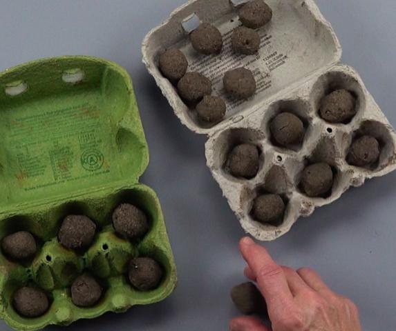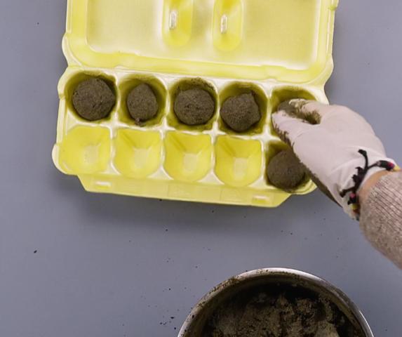 Jetzt nimmst du mit einem Löffel oder direkt mit den Händen ein wenig von der Masse ab und rollst den Teig, bis eine Kugel entstanden ist. Zum Trocknen legst du die Samenbomben einfach in einen Eier-Pappkarton.