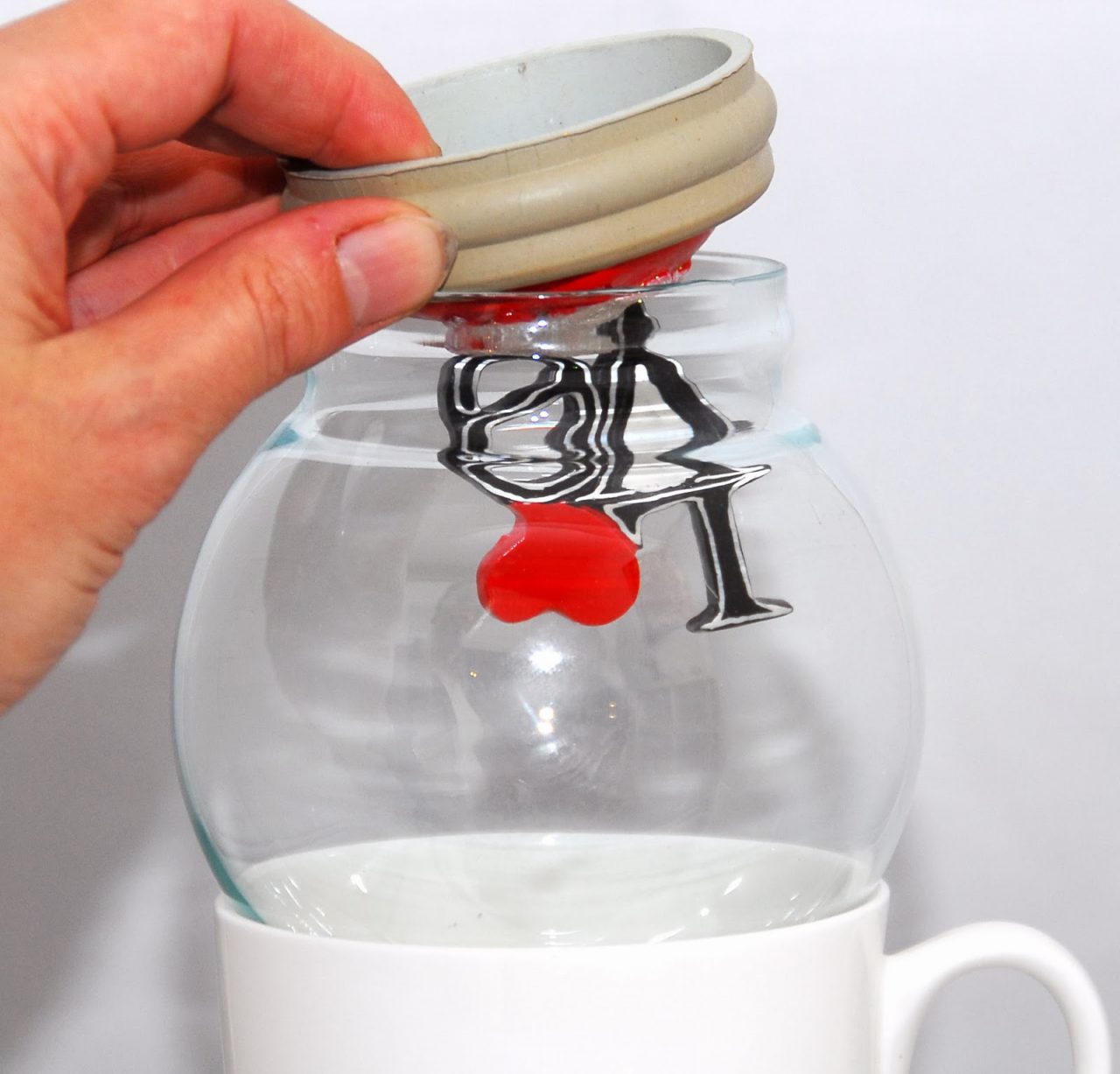 Drücken Sie dann den Gummi-Verschluss von oben fest in die Kugel. Sie können dann mit einer Spritze am Rand etwas Wasser nachfüllen, damit am Ende keinerlei Luft mehr in der Kugel ist, ansonsten gibt es beim Kippen der Kugel eine Luftblase. Immer wieder den Gummi nachdrücken und die Kugel etwas stehen lassen und beobachten, ob sich noch später eine Luftblase bildet. Eventuell Wasser nachspritzen.