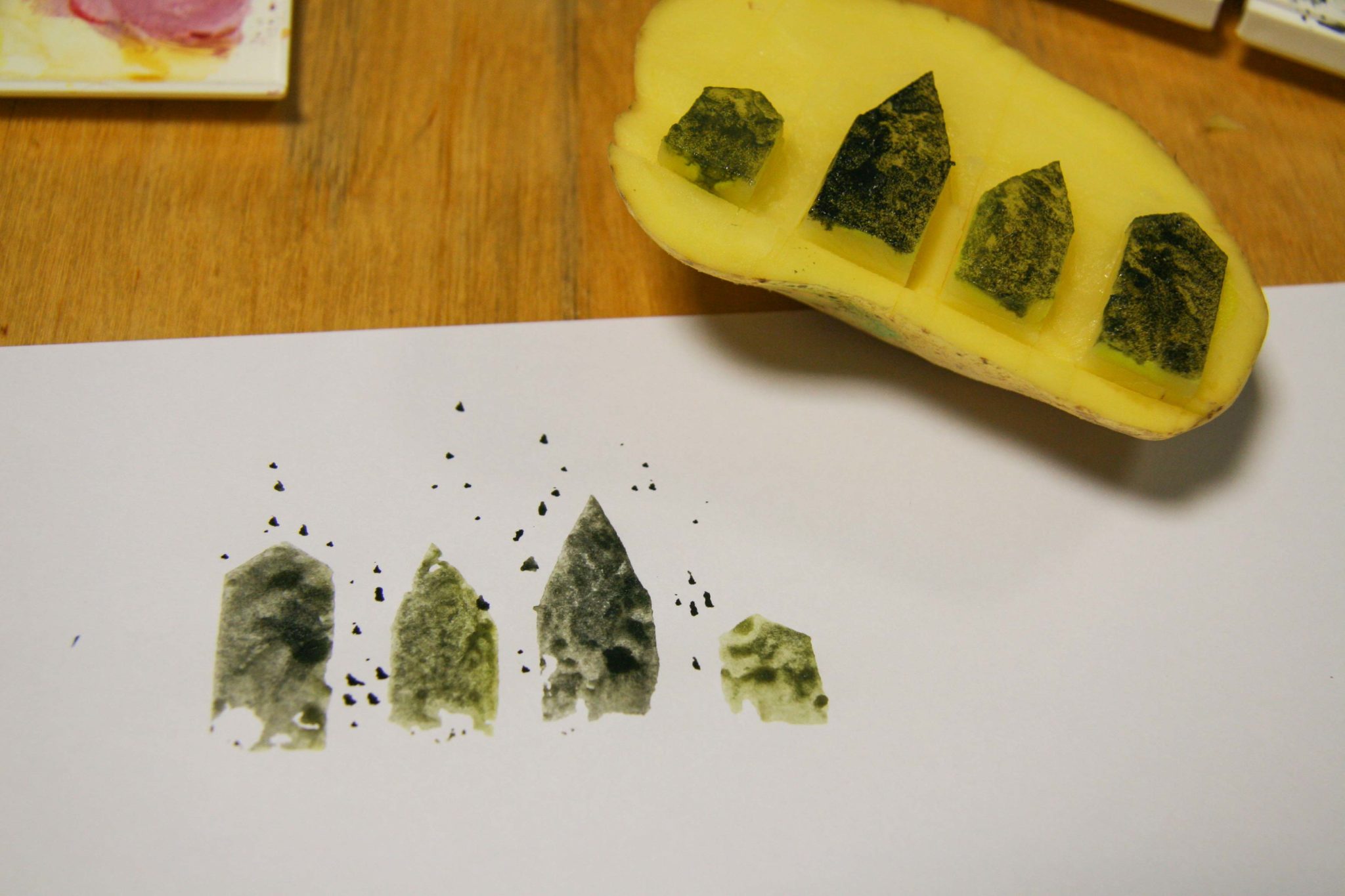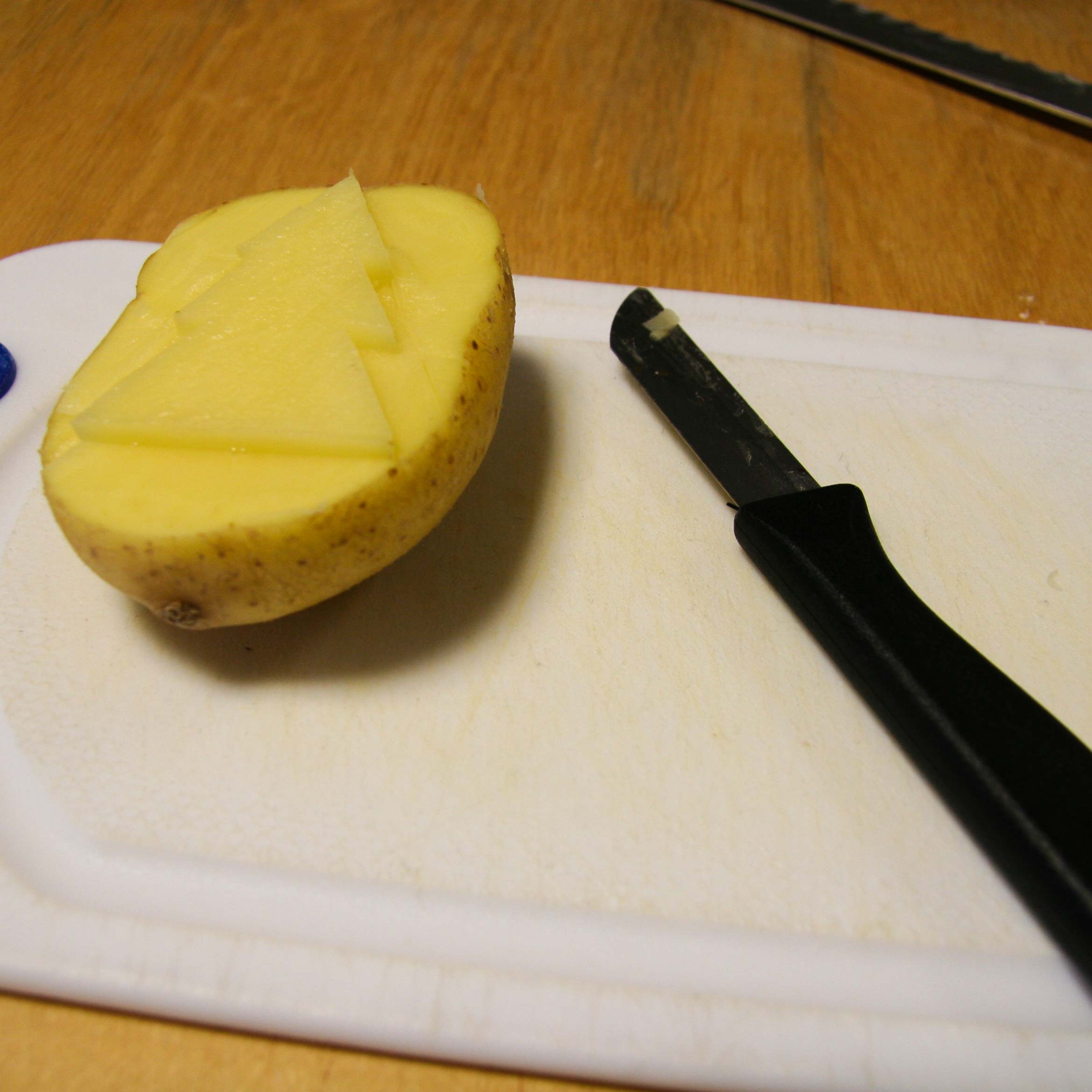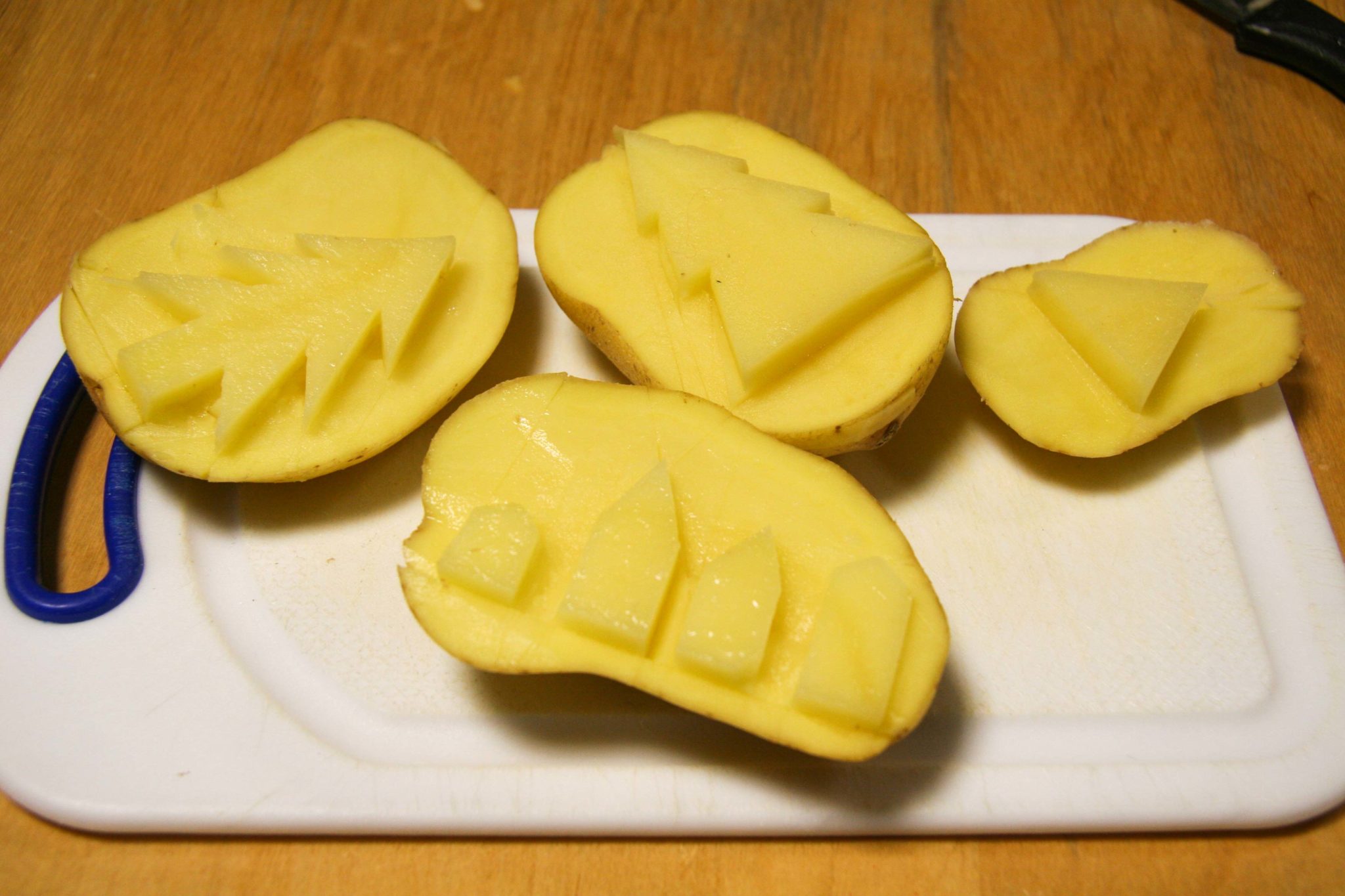Als allerstes, natürlich, schneidest du deine Kartoffeln in 2 Hälften. Pro Kartoffel kannst du also 2 Stempel machen.