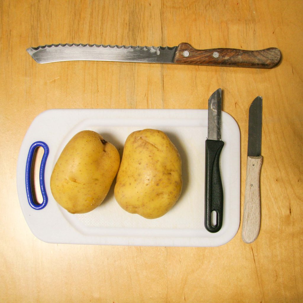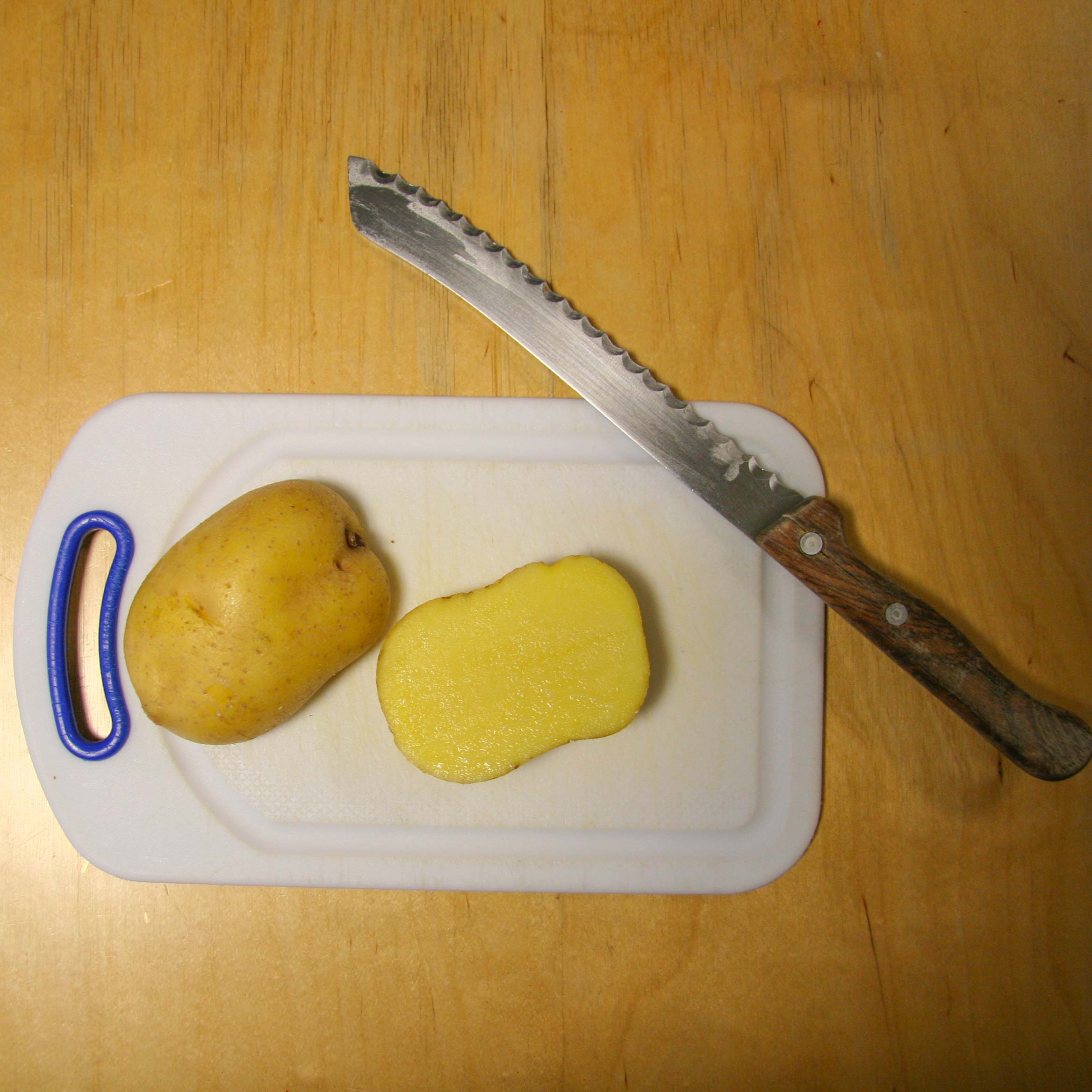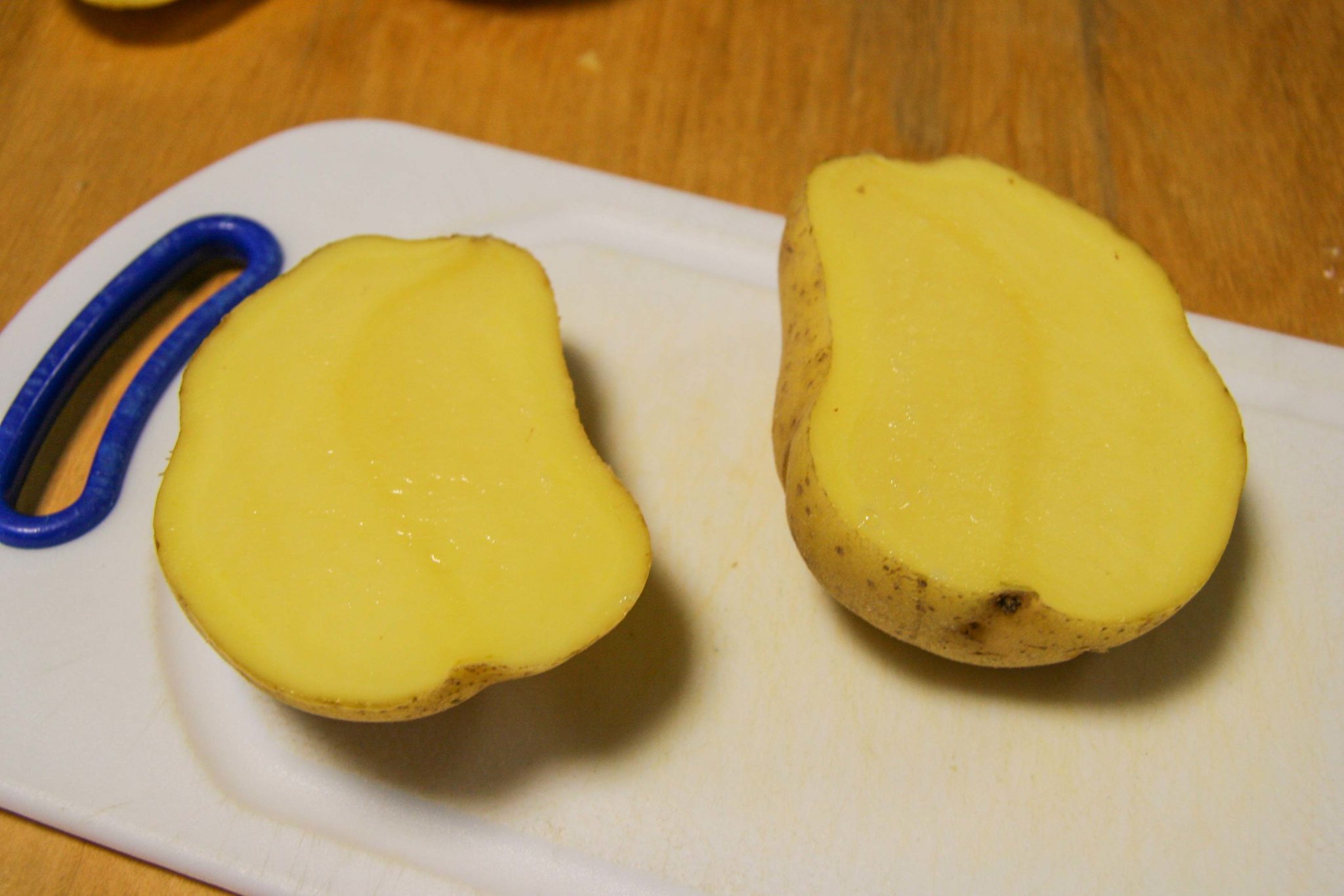 Als allerstes, natürlich, schneidest du deine Kartoffeln in 2 Hälften. Pro Kartoffel kannst du also 2 Stempel machen.