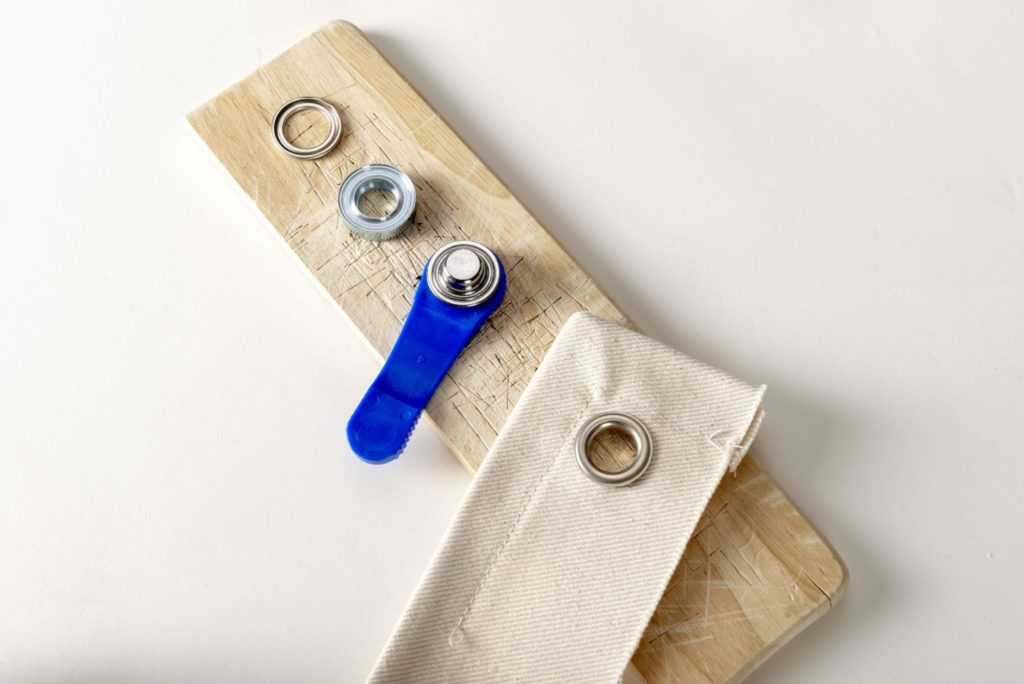 Danach werden alle Ösenplätze markiert. Anschließend mit Lochzange vorlochen und mit einer spitzen Schere einschneiden und dann die Ösen einschlagen. Dabei unbedingt ein Brett unterlegen.