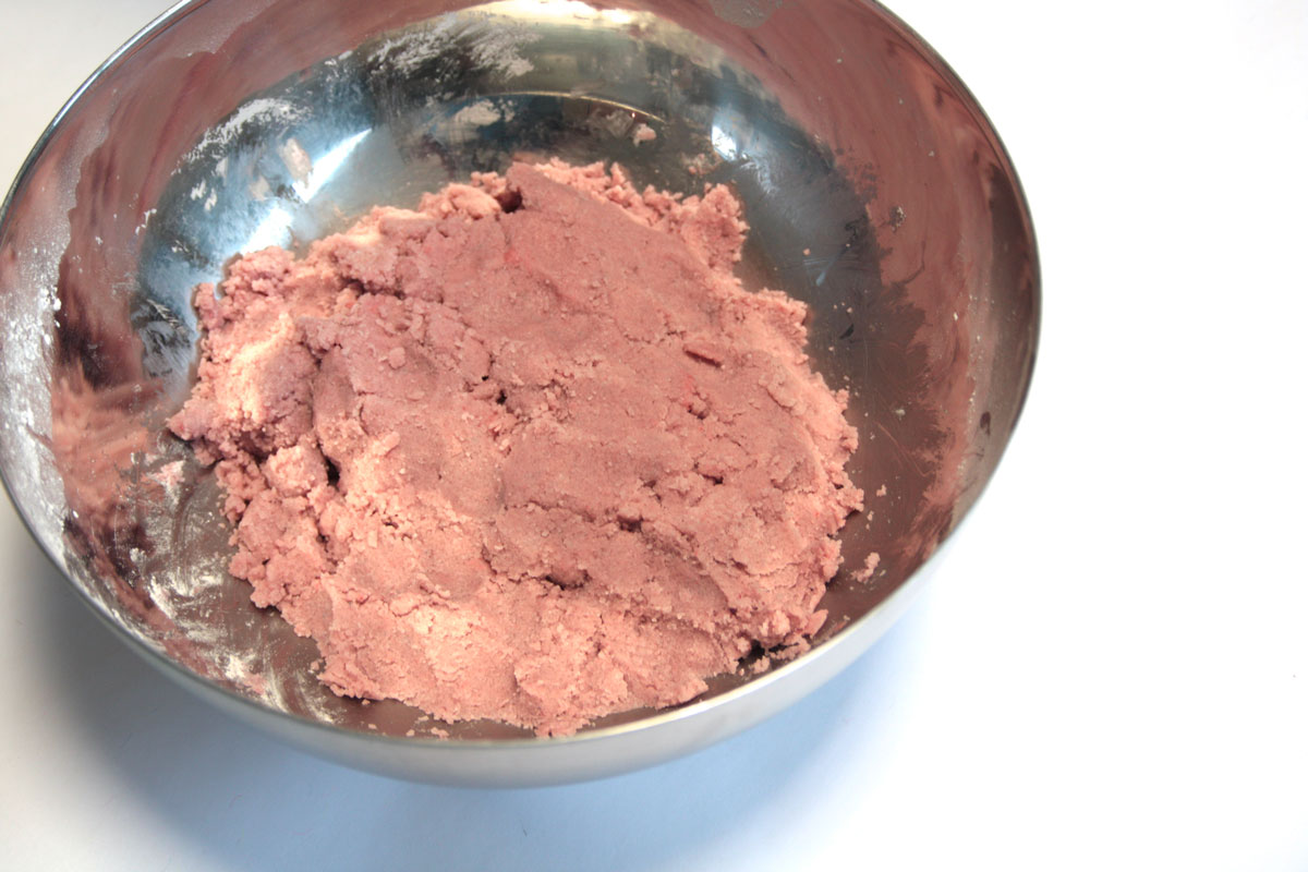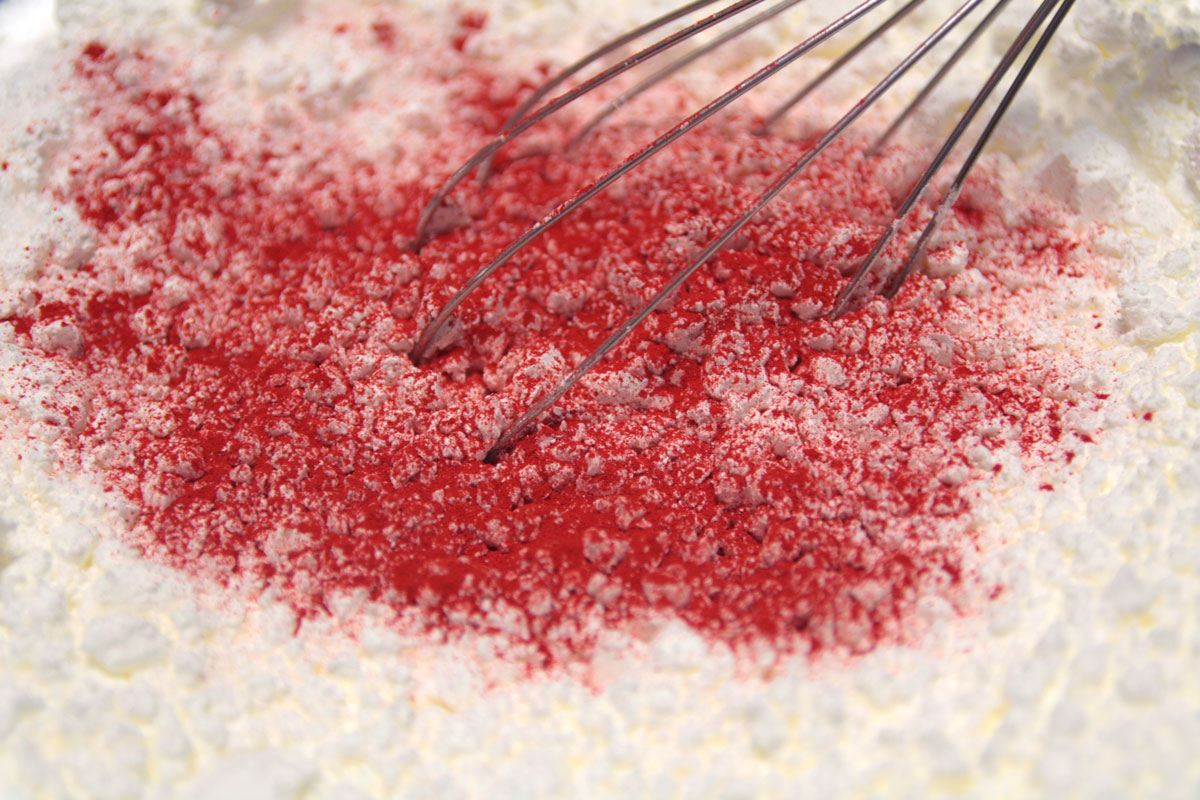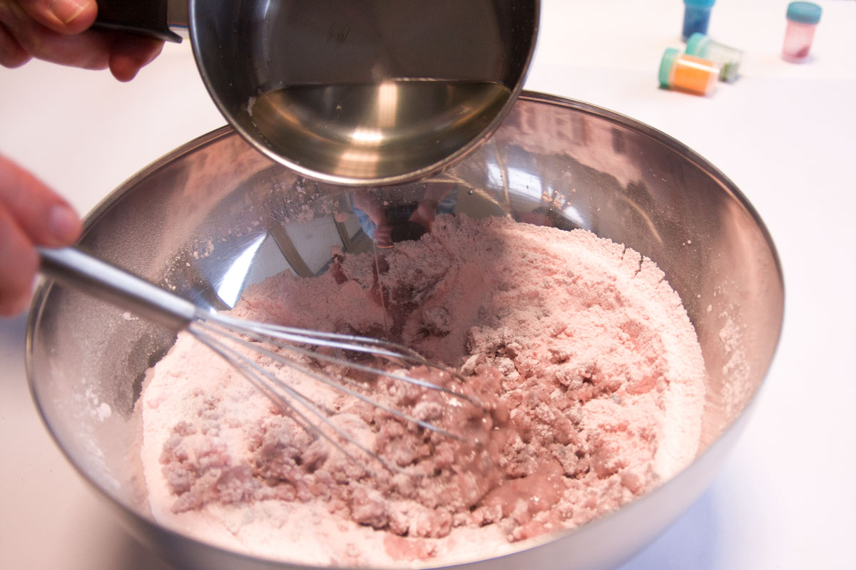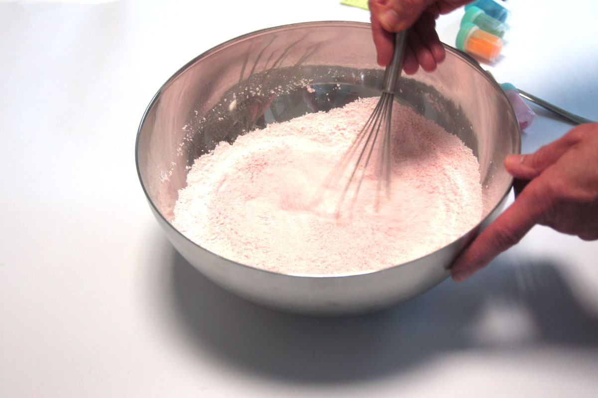 In der Schüssel werden die trockenen Zutaten wie Natron, Zitronensäure, Speisestärke und nach Belieben Speisefarbe gemischt.