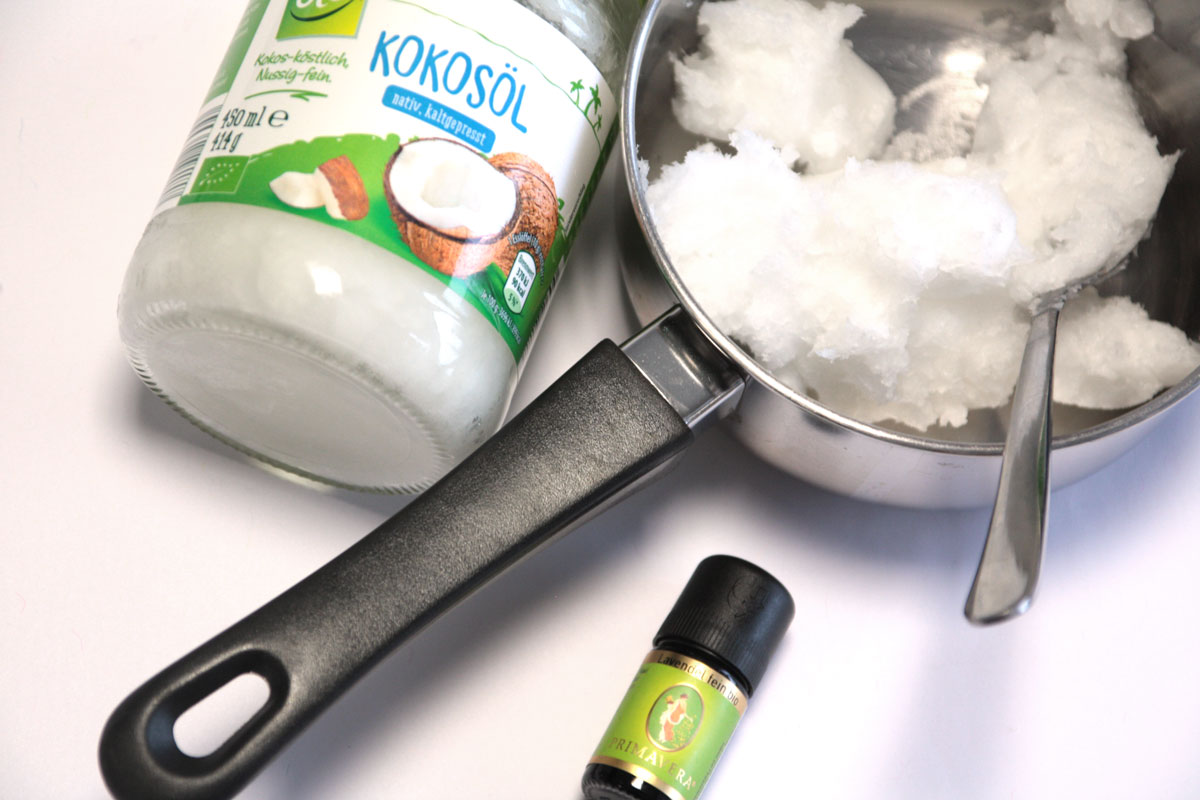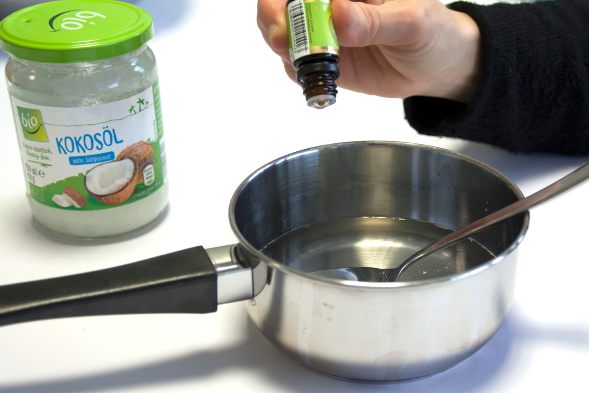 In einem Topf lässt du das Kokosöl auf kleiner Flamme flüssig werden. Wenn das Öl etwas abgekühlt ist, fügst du das ätherische Öl hinzu. Gut vermischen.