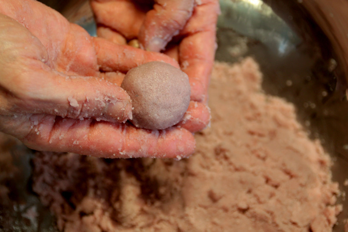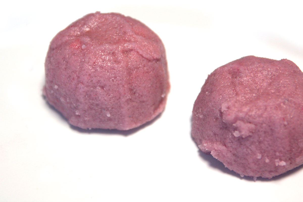 Wenn dein Badekugelteig gut vermischt ist kannst du ganz klassische Badekugeln formen. Dazu nimmst du dir die gewünschte Menge „Teig“ und formst sie zu einer festen Kugel.