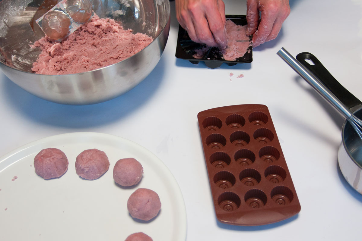 Die Badekugeln oder -pralinen müssen jetzt noch einige Stunden gekühlt werden. Die Pralinen können nach dem Kühlen aus der Form gedrückt werden.