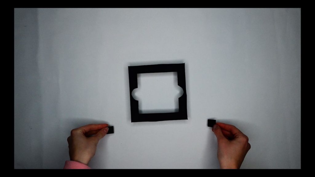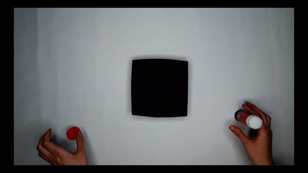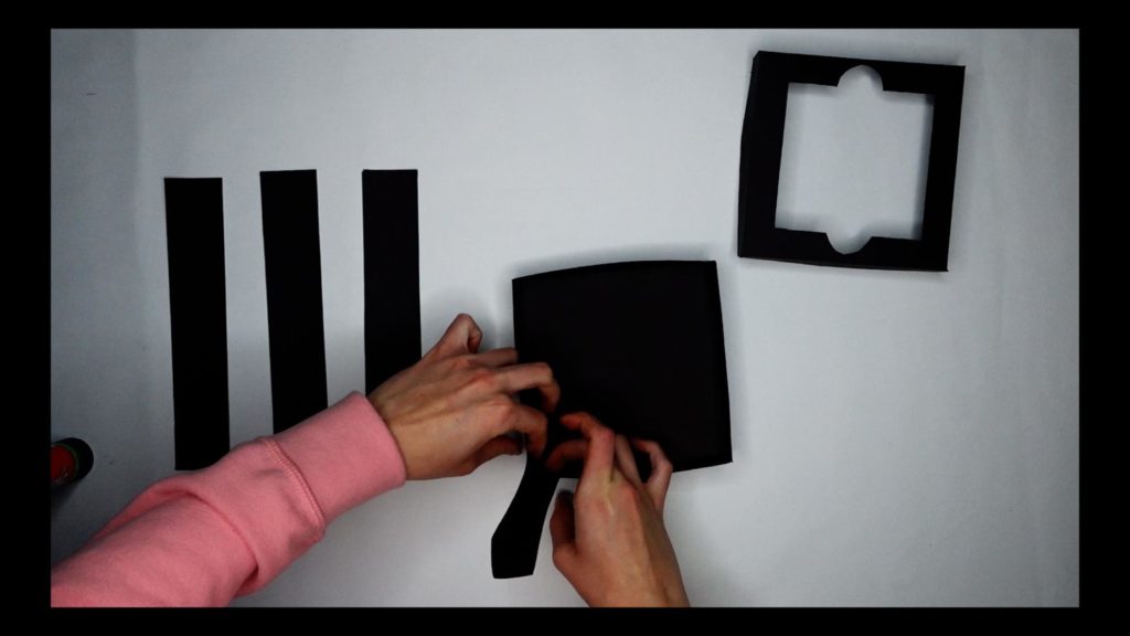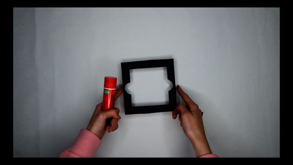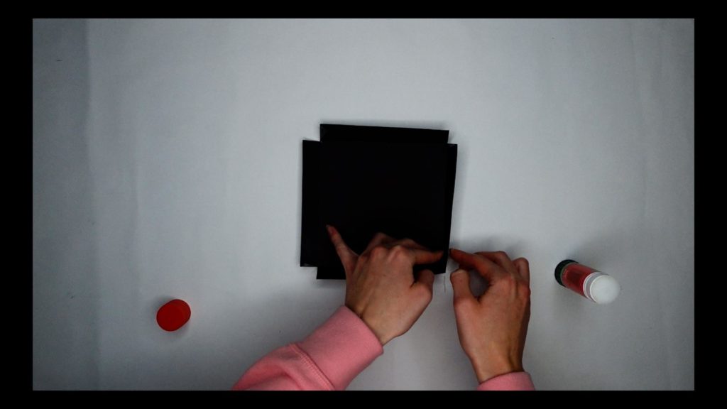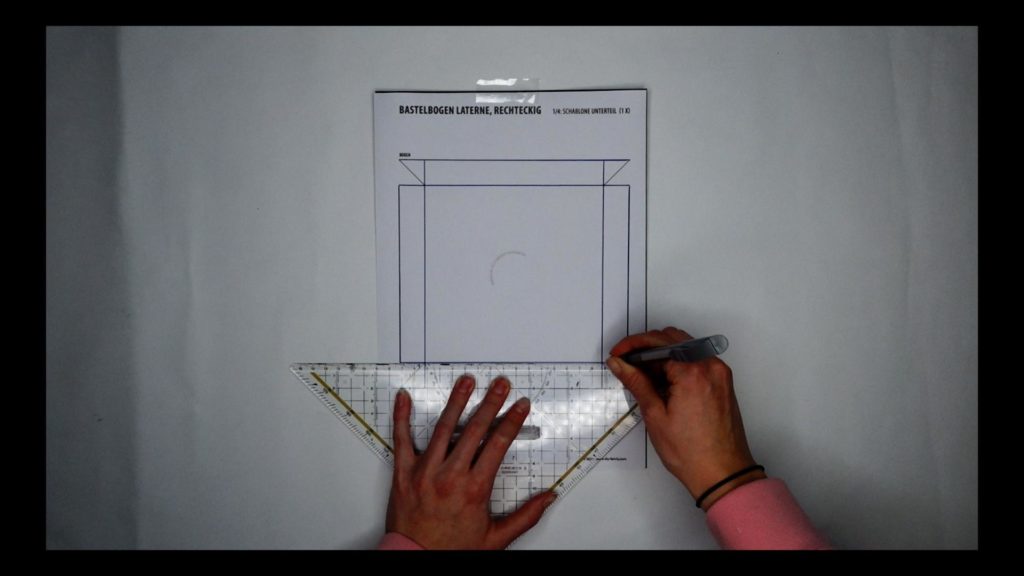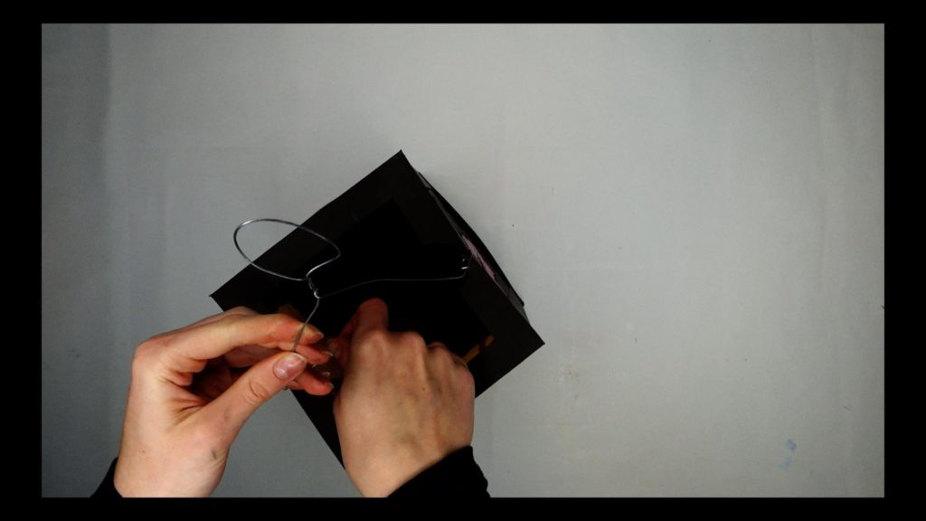 Als Stabilisierung für den Draht klebt ihr die beiden kleinen Quadrate auf die Seiten des Deckels, an denen Später der Draht durch soll.