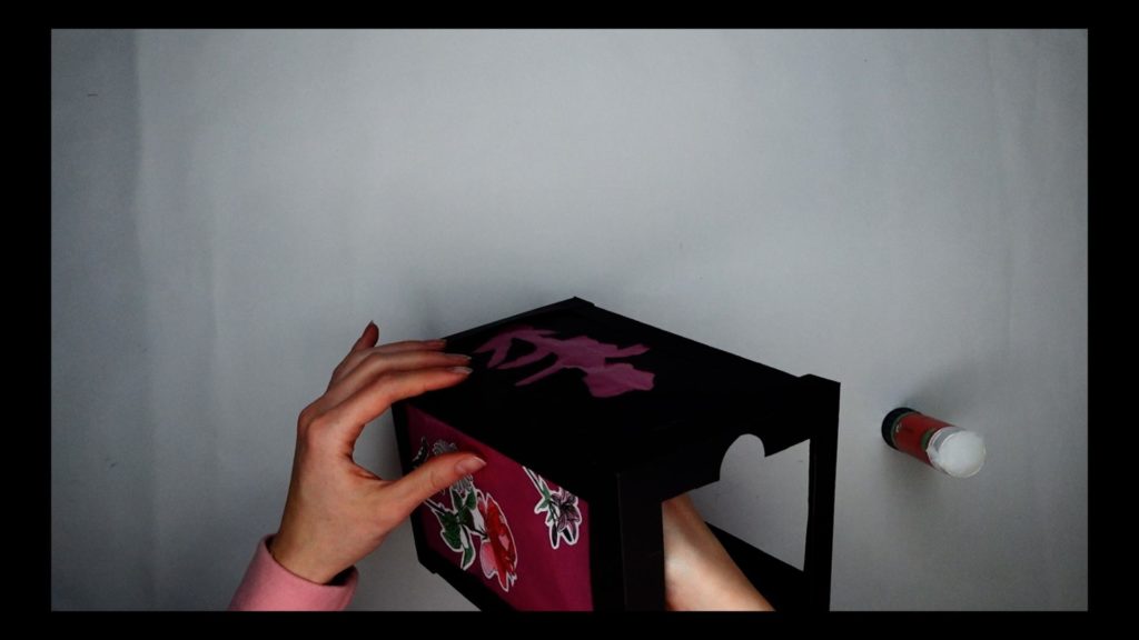 Anschließend wird das Gerüst zusammengebaut. Dafür tragt ihr Kleber auf die Ecken des Deckels und des Bodens auf und klebt es mit den Seitenteilen zusammen.