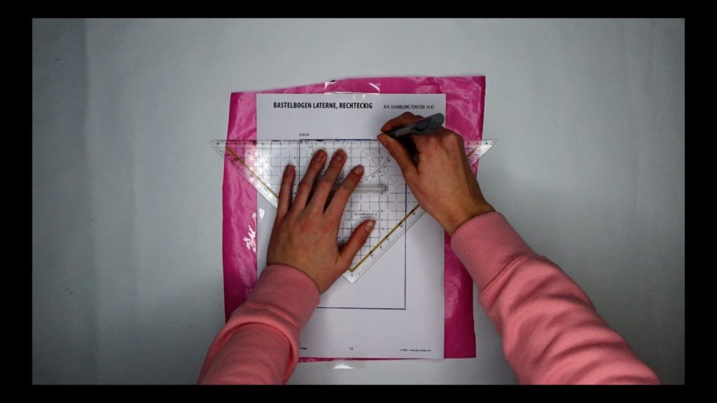 Danach beginnt ihr die Linien der Motive mit einem spitzen Stift nachzuziehen, damit die durchdrücken und auf der Pappe sichtbar werden.