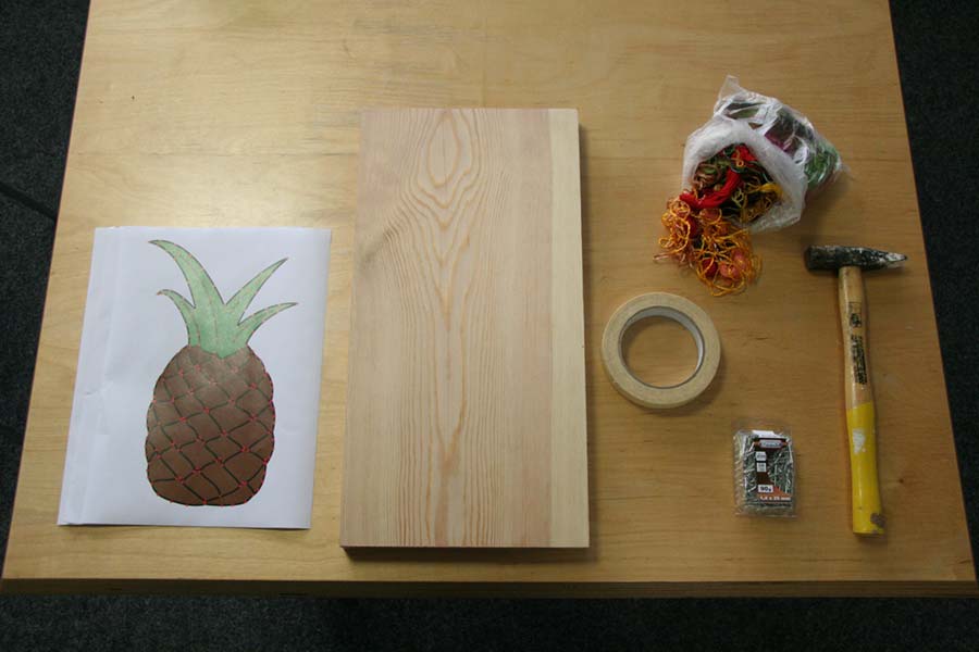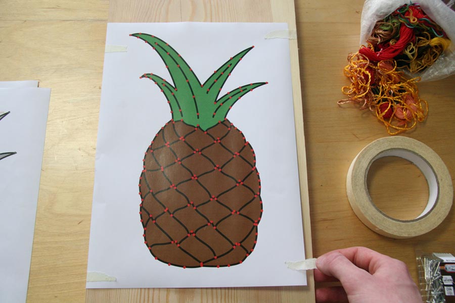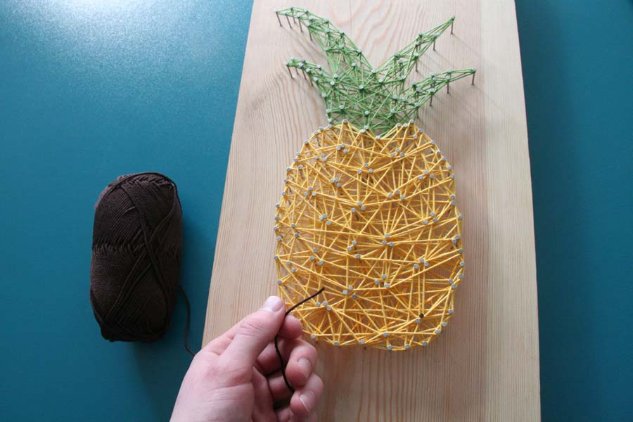 Einen tollen Effekt erzielst du, wenn du Konturlinien mit einem anders farbigen Garn ziehst. Das hebt auch das Muster der Ananas hervor. Orientiere dich an deiner Schablone, um bei den ganzen Nagelköpfen nicht den Überblick zu verlieren.