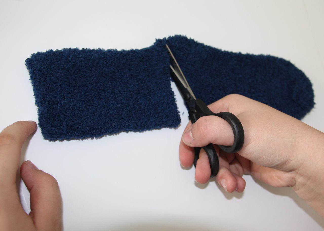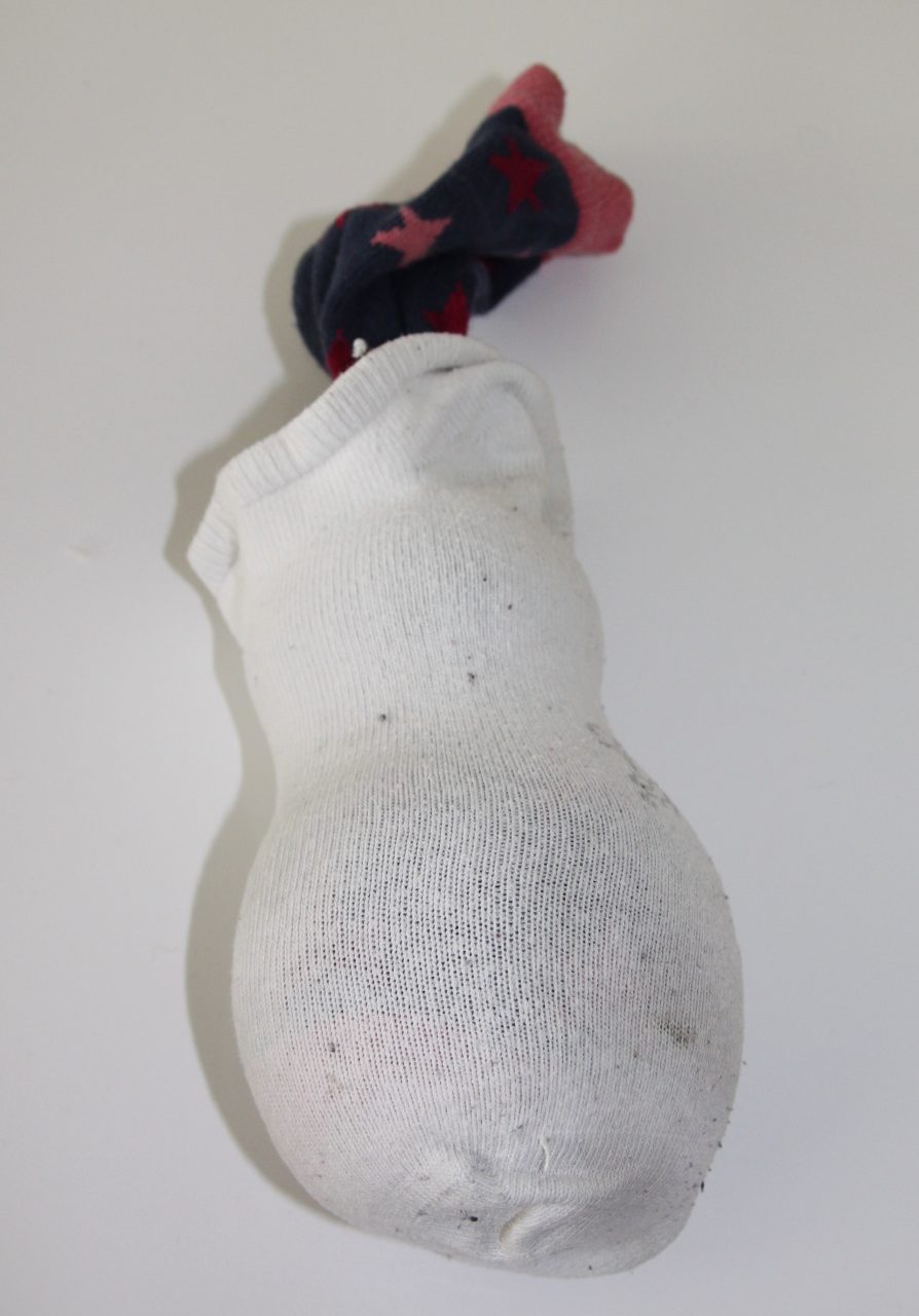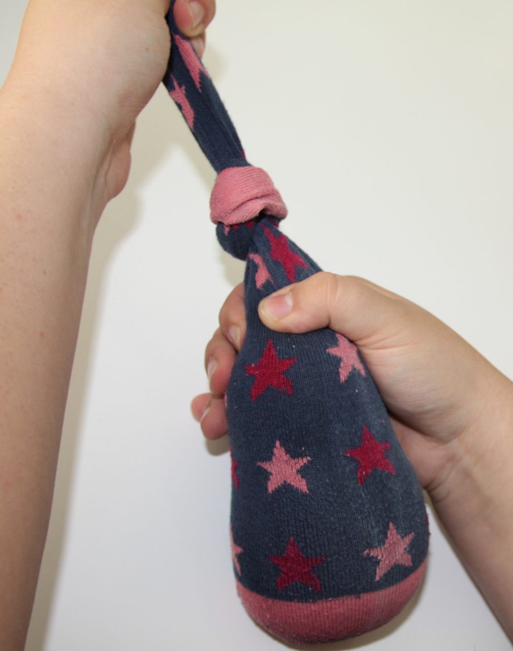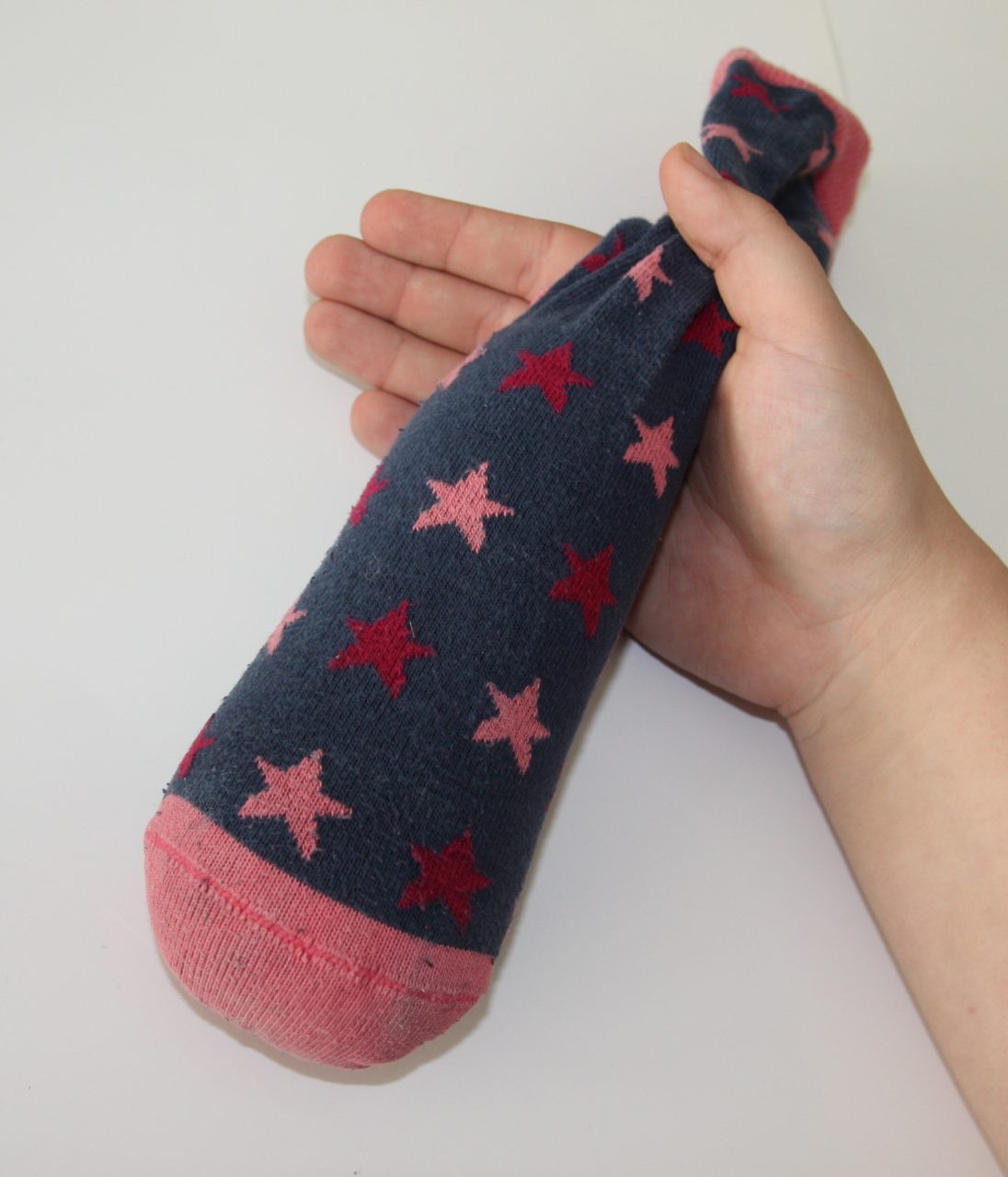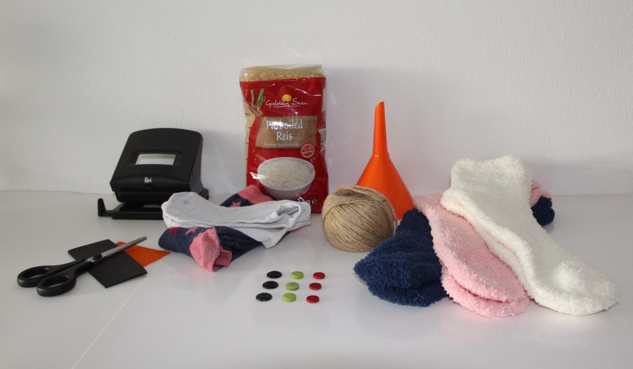 Solltet ihr vorher keine großen weißen Socken gehabt haben, in die ihr den Reis gefüllt habt, solltet ihr spätestens jetzt eine haben! Denn wenn ihr die flauschige Socke über eine bunte zieht, kann das Muster und die Farbe durchkommen! 🙂