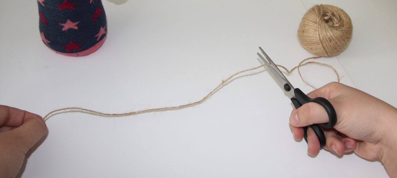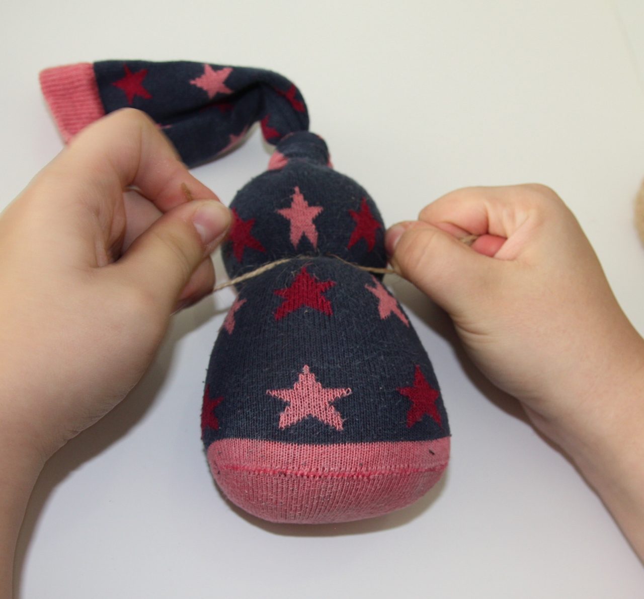 Nun wird ein Band zurecht geschnitten und zwar so, dass man es locker um die Socke wickeln kann. Dann platziert man das Band so, wie man den Kopf und den Körper später haben möchte. Normalerweise ist der Kopf natürlich kleiner als der Körper! 😉
