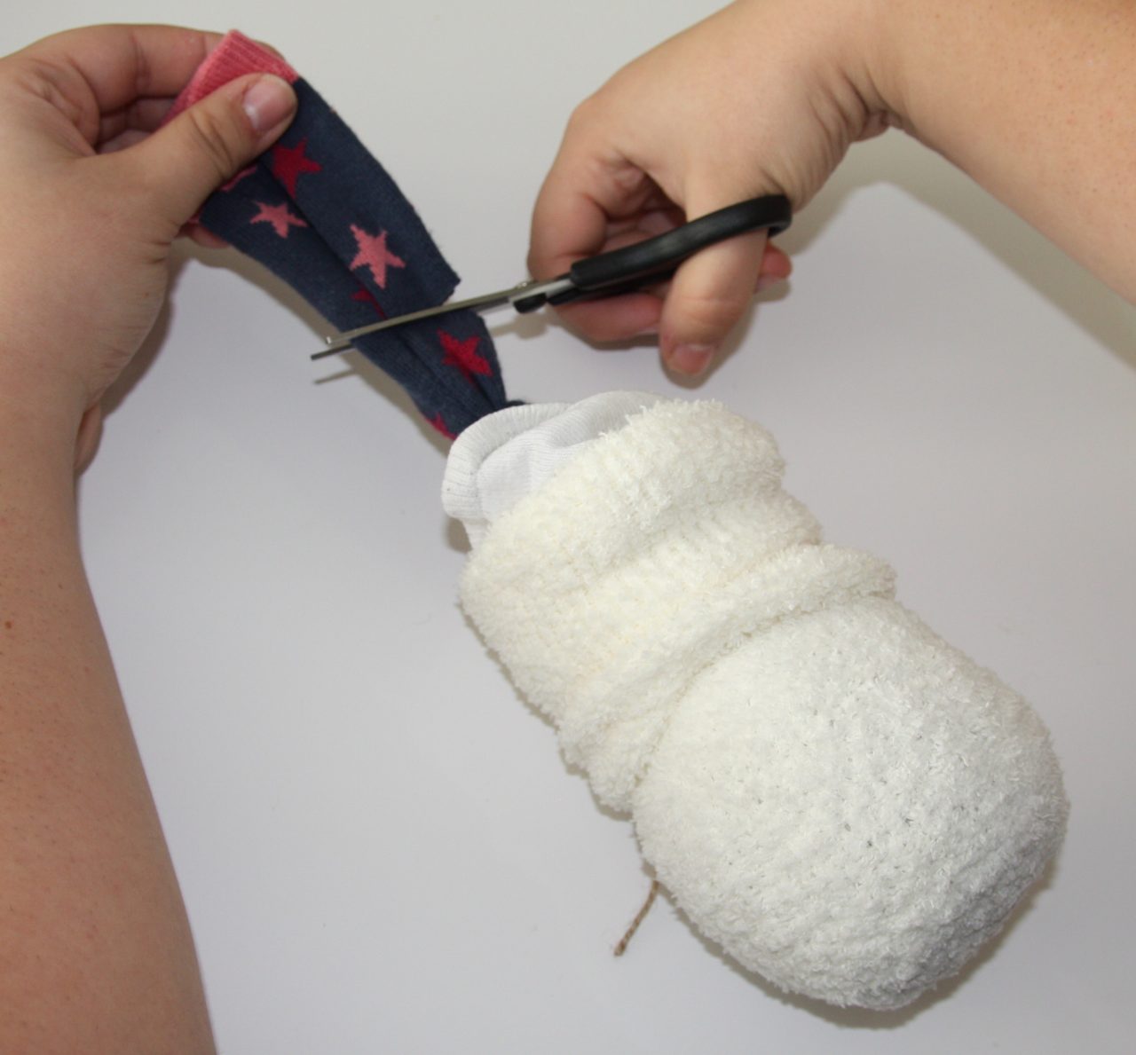Jetzt zieht man dem Schneemann noch einen farblich passenden Schal an! Dazu schneidet man von dem Rest der bunten Socke einen Streifen ab, schneidet ihn an der Seite auf und knotet ihn wie man es möchte um den Hals des Schneemannes.