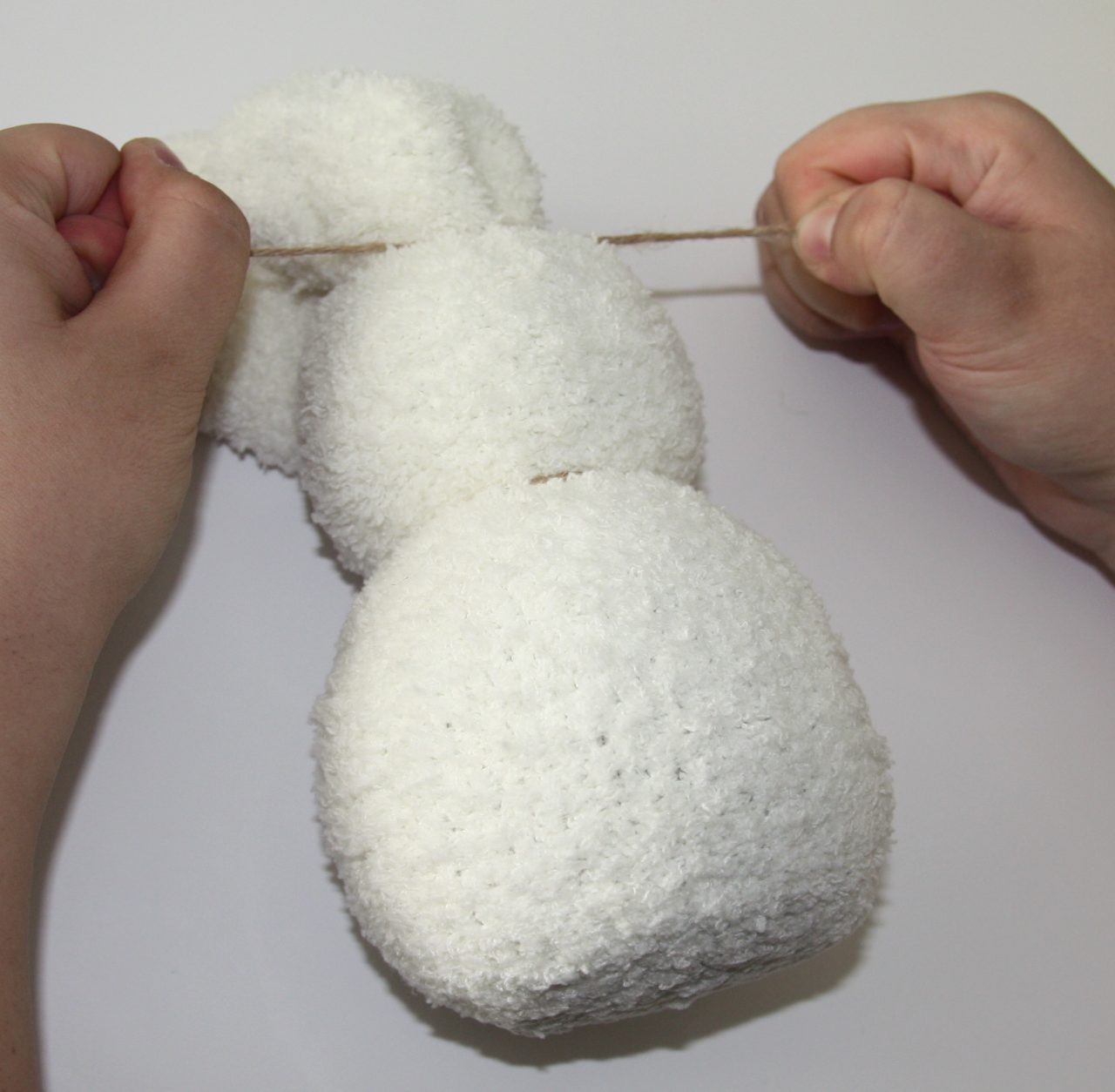Dann wird das Band fest zusammen geknotet, sodass die beiden Kugeln deutlich zu erkennen sind. Beide Teile des Schneemannes sollten schön straff sein!
