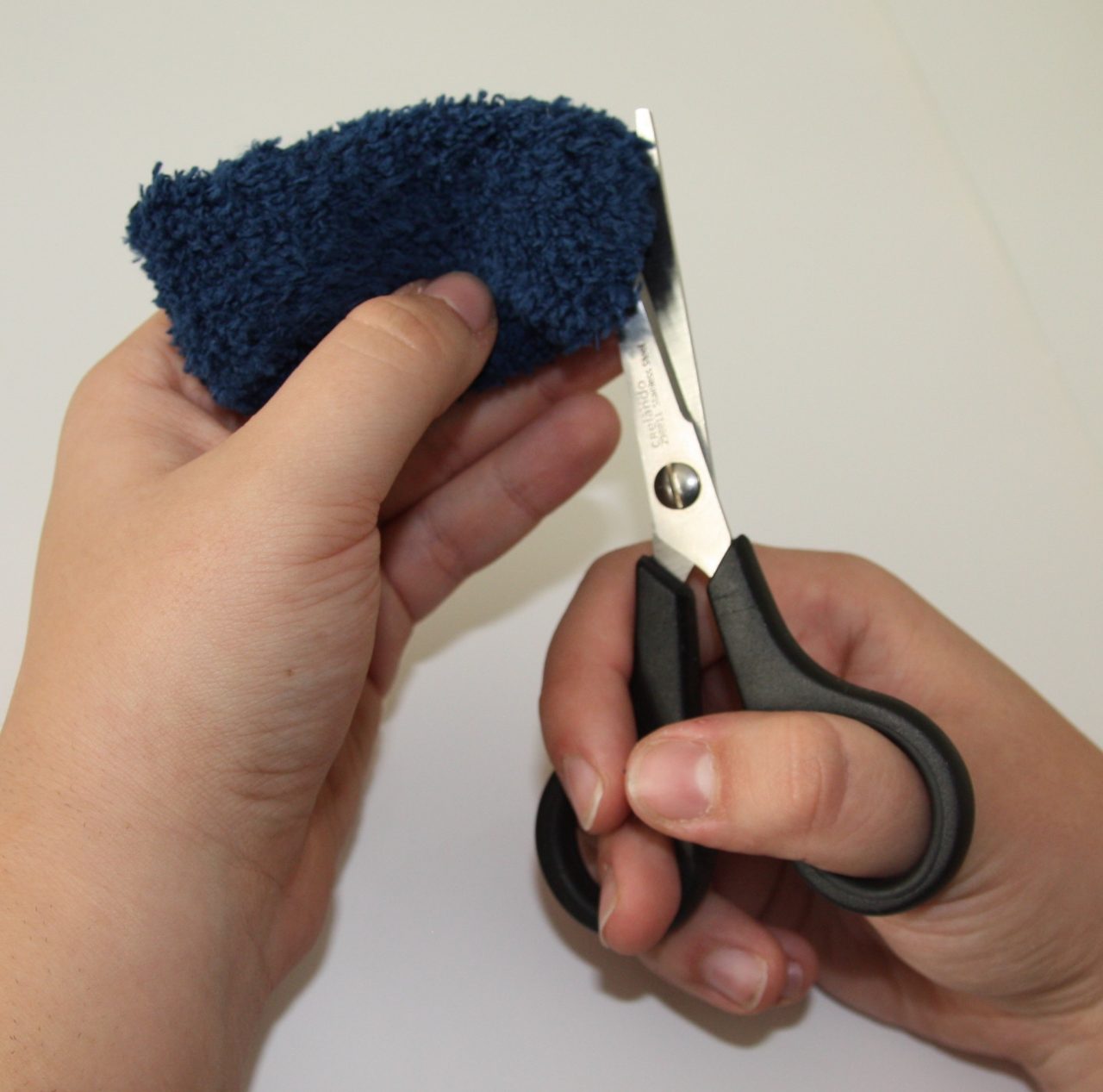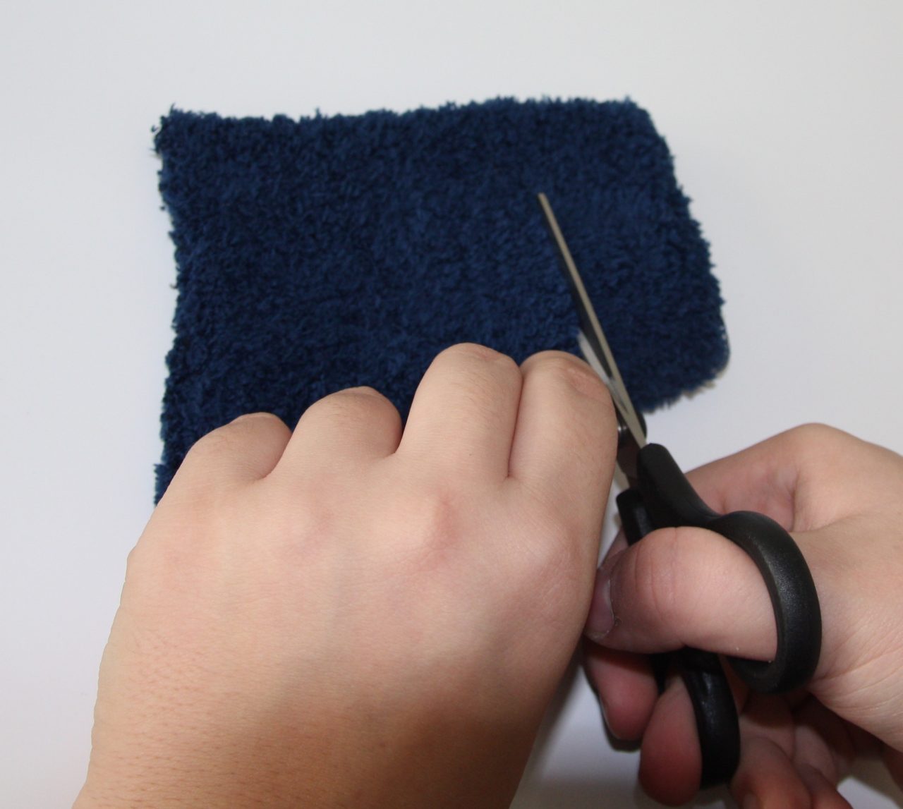 Jetzt wird sich um die Reste der Socken gekümmert, die oben abstehen! Schneidet den ersten Socken ein Stück über dem Knoten ab, zieht die flauschige Socke darüber und knotet sie dort auch fest. Dann könnt ihr auch hier den Rest einfach abschneiden. Keine Sorge, die kleine Palme verschwindet später! 😉
