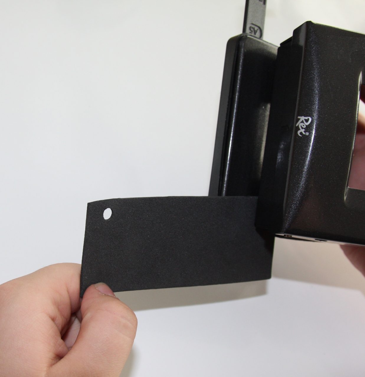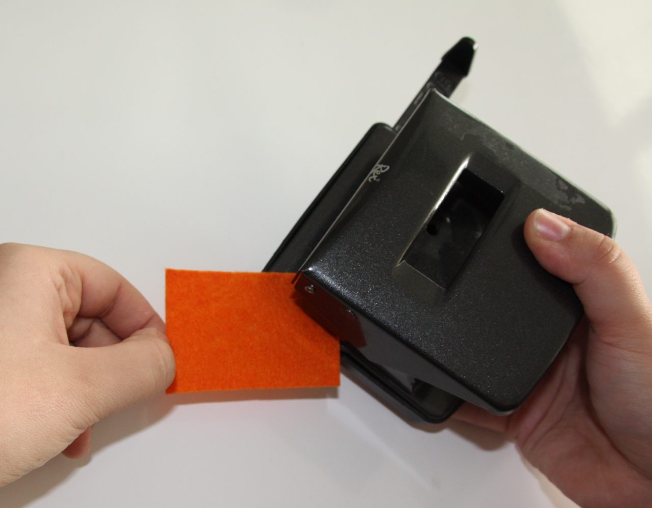 Jetzt ist der Schneemann fast fertig! Ihm fehlt nur noch ein Gesicht! Dazu nimmt man einen Locher zur Hand und stanzt mit ihm 2 Augen aus dem Moosgummi und eine orangene Nase aus dem Filz! Mit ein wenig Heißkleber klebt man die Punkte dann als Gesicht auf den Schneemann 🙂