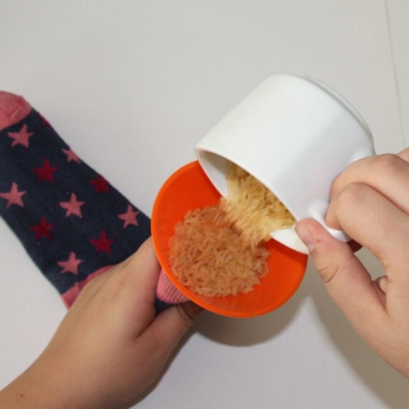 Zuerst nimmt man sich eine alte Socke und steckt den Trichter oben in die Öffnung. Danach füllt man den Reis ganz vorsichtig mit der Hilfe einer Tasse und dem Trichter in die Socke. Man kann so viel Reis nehmen, wie man möchte, je nachdem, ob man einen kleineren oder einen größeren Schneemann bastelt! 🙂