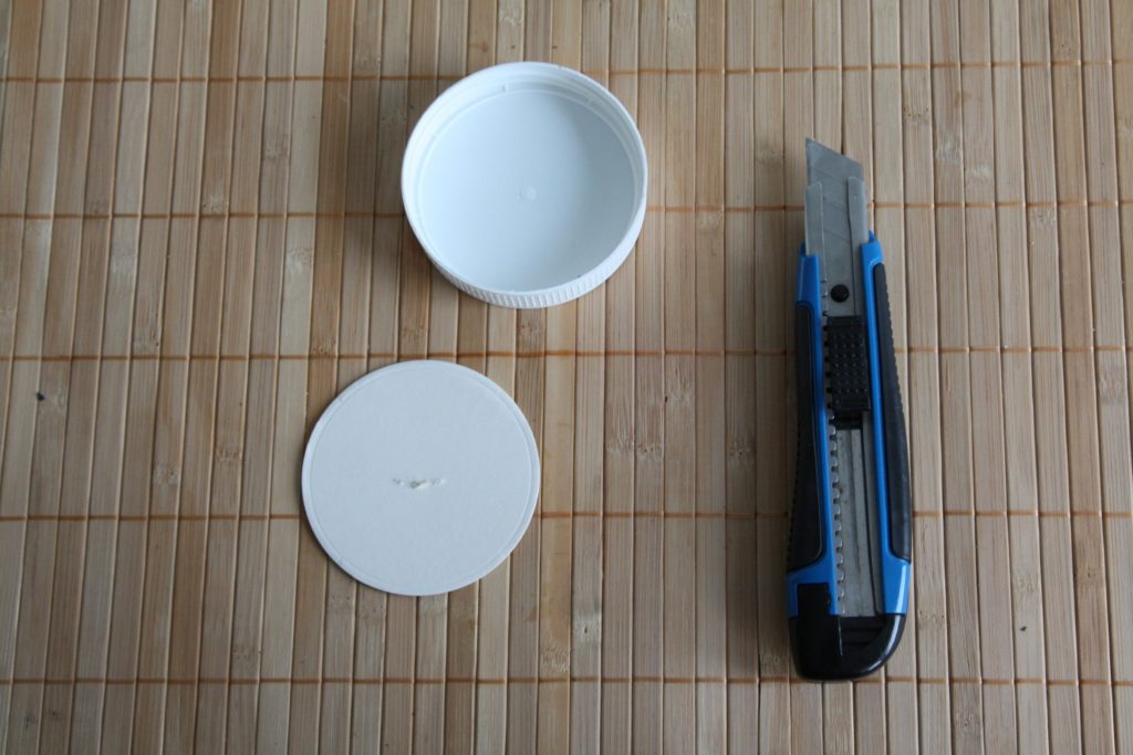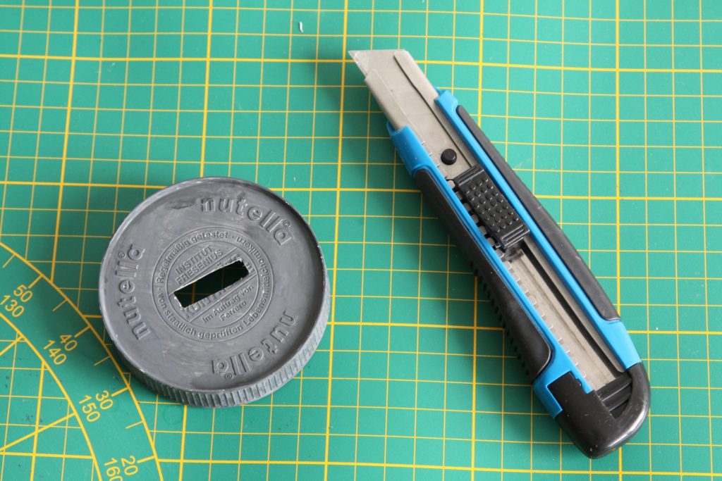 - während der Deckel trocknet mit dem Cutter in die Mitte des Deckels einen ca. 8mm Schlitz schneiden