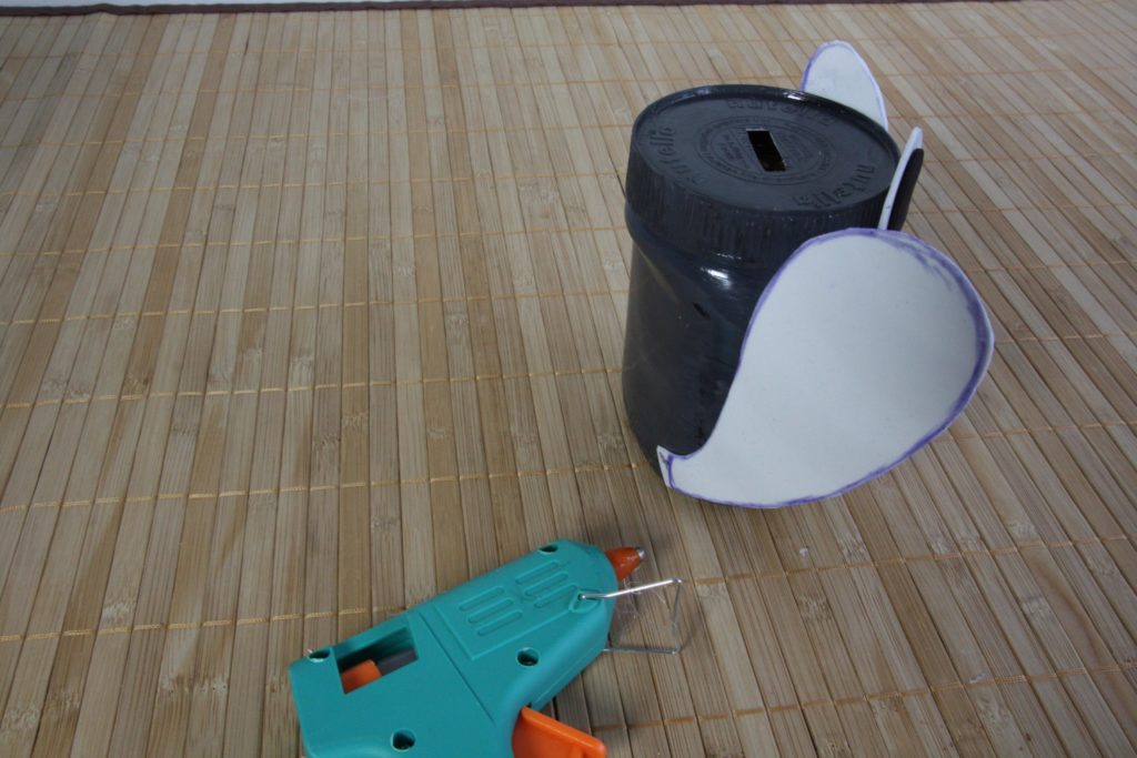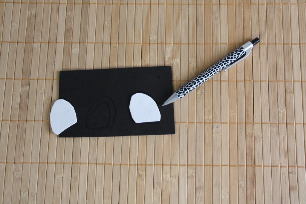 - Weiße Ohren als Schablone auf dem schwarzen Moosgummi benutzen und kleinere Version davon aufzeichnen und ausschneiden