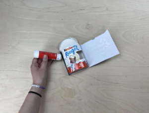 Ardından kinder çikolatasının dış kartonu için resmi kesiyoruz. Sonra dış kısmına yerleştirip tutkal ile yapıştırıyoruz. Son olarak hazırladığınız çikolataları kutusuna yerleştirin. Bu kadar.