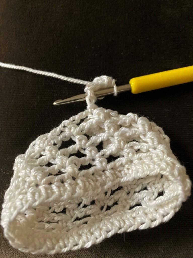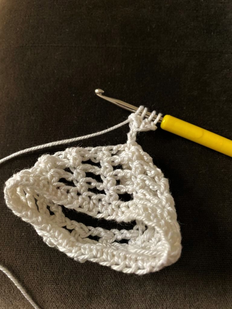 Ich habe insgesamt vier Runden gehäkelt, das ist abhängig davon, wie hoch dein Teelichtglas ist. Jede Runde beginnt immer mit fünf Luftmaschen. In die dritte Masche häkelst ein Stäbchen. Du wiederholst das folgende Muster bis zum Ende der Runde: Zwei Luftmaschen, in die dritte Masche ein Stäbchen. Du schließt die Runde, in dem du eine Kettmasche in dritte der fünf anfänglichen Luftmaschen häkelst.