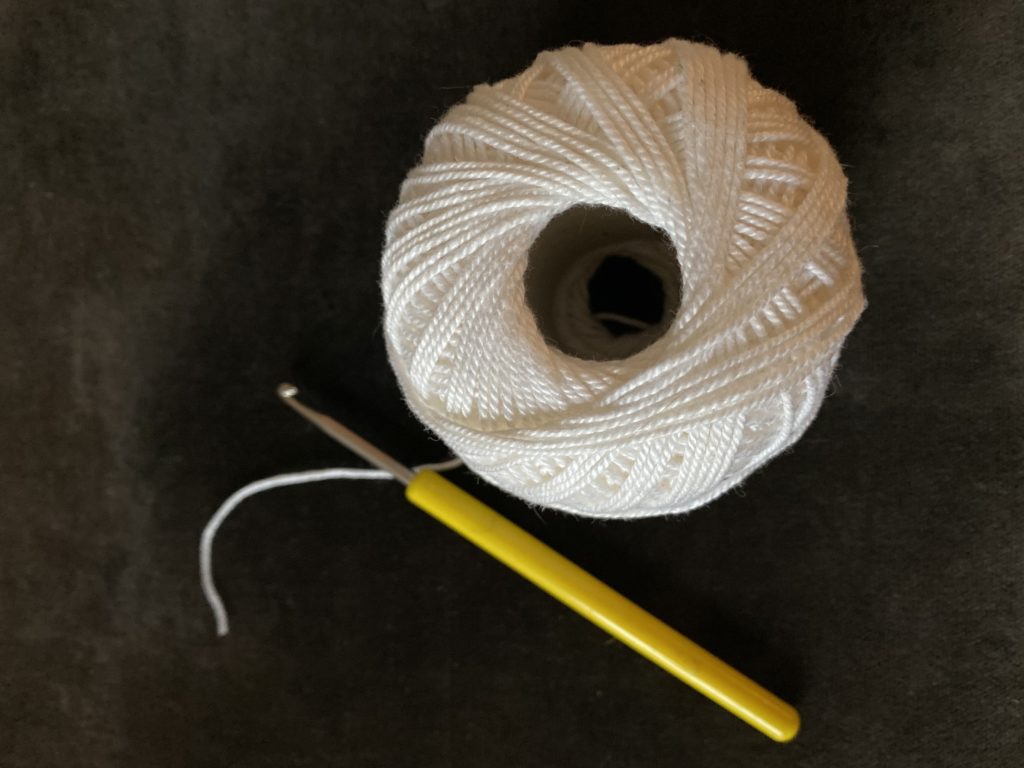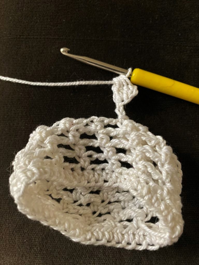 Als Rand habe ich eine Bommelkante gehäkelt. Das geht wie folgt: Du häkelst fünf Luftmaschen. Dann häkelst du drei Stäbchen in die dritte Luftmasche, aber immer nur bis zur Hälfte, so dass du vier Maschen auf der Häkelnadel hast. Du häkelst diese mit einer Masche ab und bildest den Bommel, in dem du jetzt eine Kettmasche in die dritte Anfangsluftmasche häkelst. Jetzt kommen zwei Luftmaschen und eine Kettmasche in das vorangegangene Stäbchen. Diesen Vorgang wiederholst du, bis du eine Bommelreihe als Abschluss gehäkelst hast.