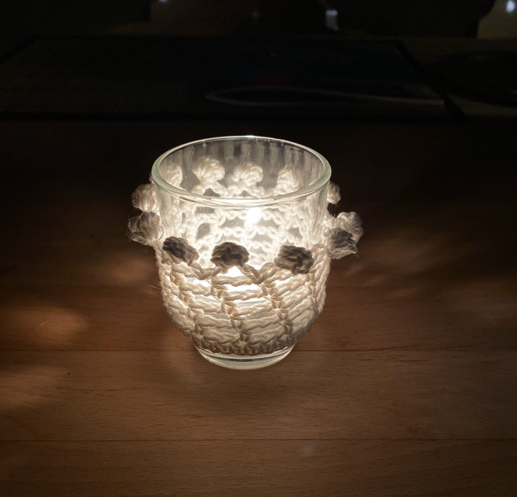 Hallo, hier ist Ella. Ihr kennt es ja sicher selbst: Teelichter machen eine super schöne Stimmung, aber nicht immer sind die Teelichthalter besonders schön, sondern sehr schlicht und eher ausdruckslos. Da habe ich mal mit etwas Wolle und einer Häkelnadel herum experimentiert. Das Ergebnis ist eine super schöne Teelichthülle, die bei brennender Kerze schöne Bilder an die Wand zeichnet.