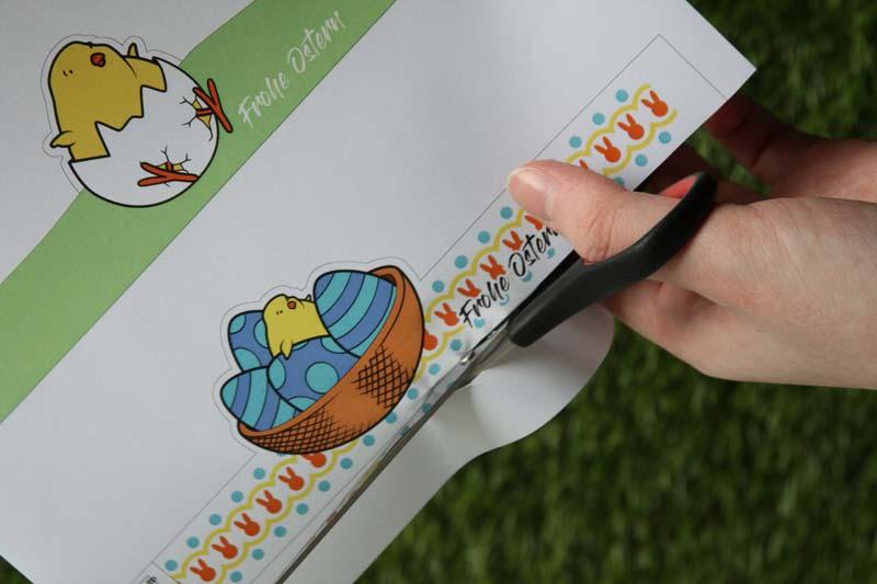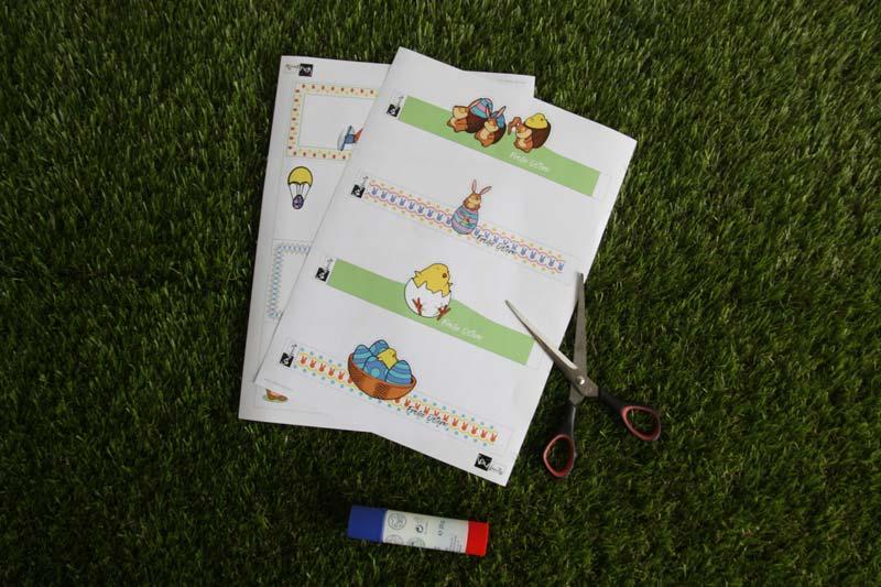 Nachdem ihr die Vorlagen ausgedruckt habt, schneidet ihr die Bänder und die Namensschilder aus.