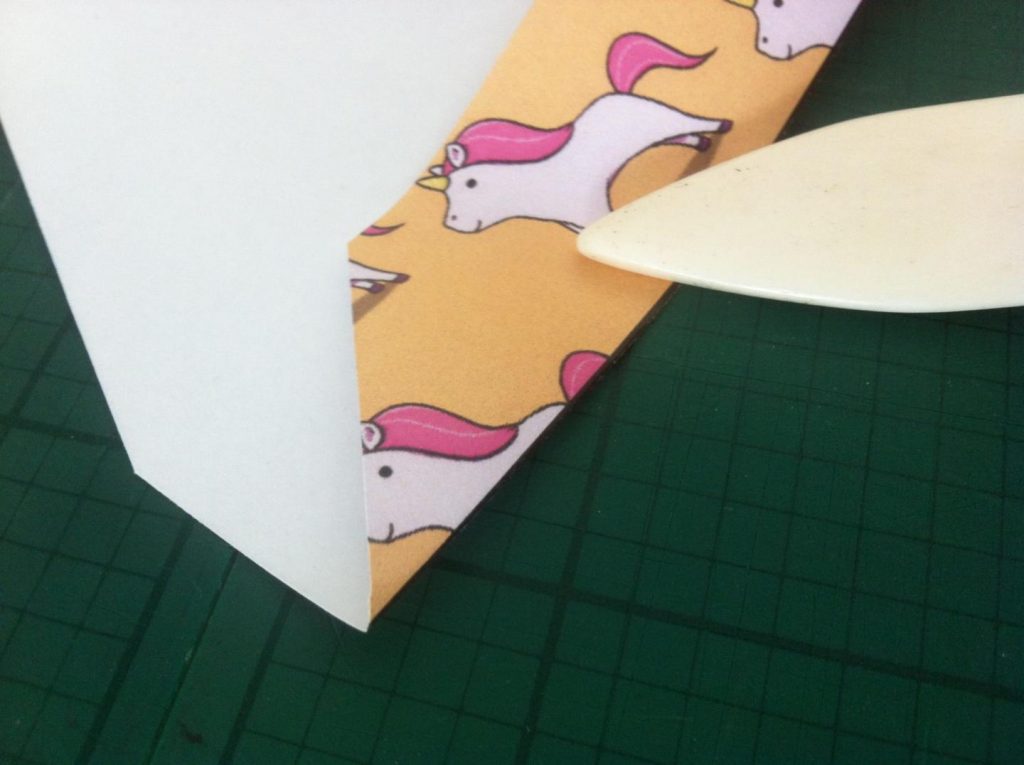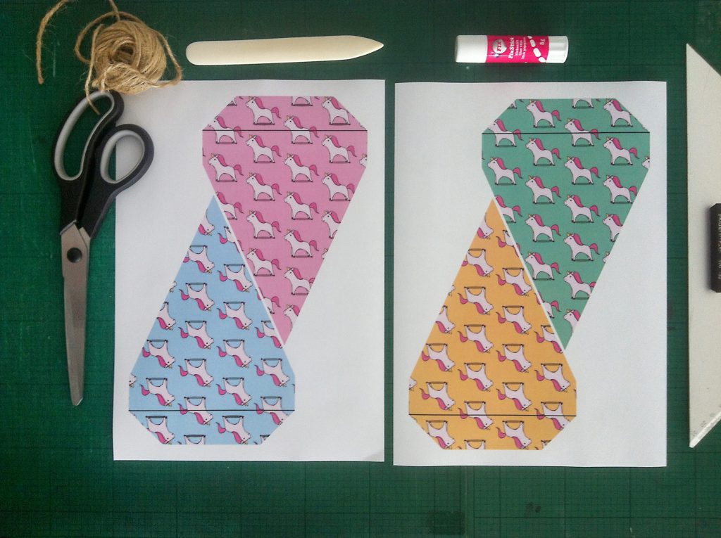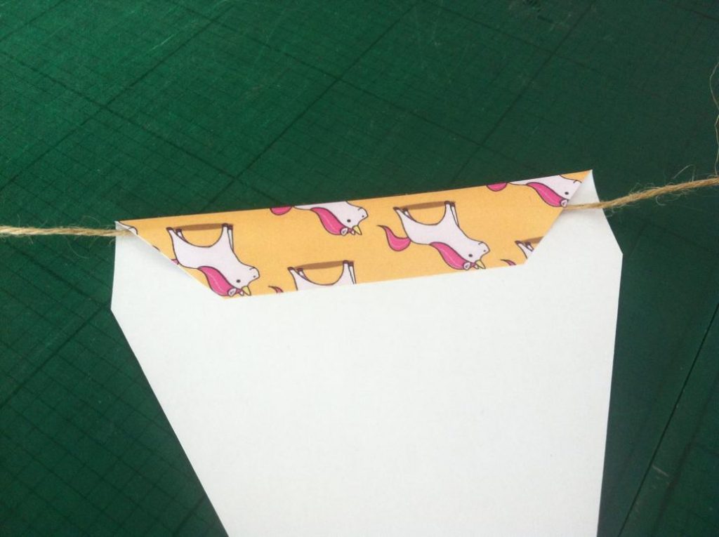 Die dünnen, schwarzen Linien, die am oberen Teil der Einhorn-Fahnen aufgedruckt sind, dienen als Faltlinien. An diesen falte ich nun den oberen, dünnen Teil nach hinten. And dieser Lasche werde ich später die Fahnen an der Kordel befestigen und zusammenkleben.