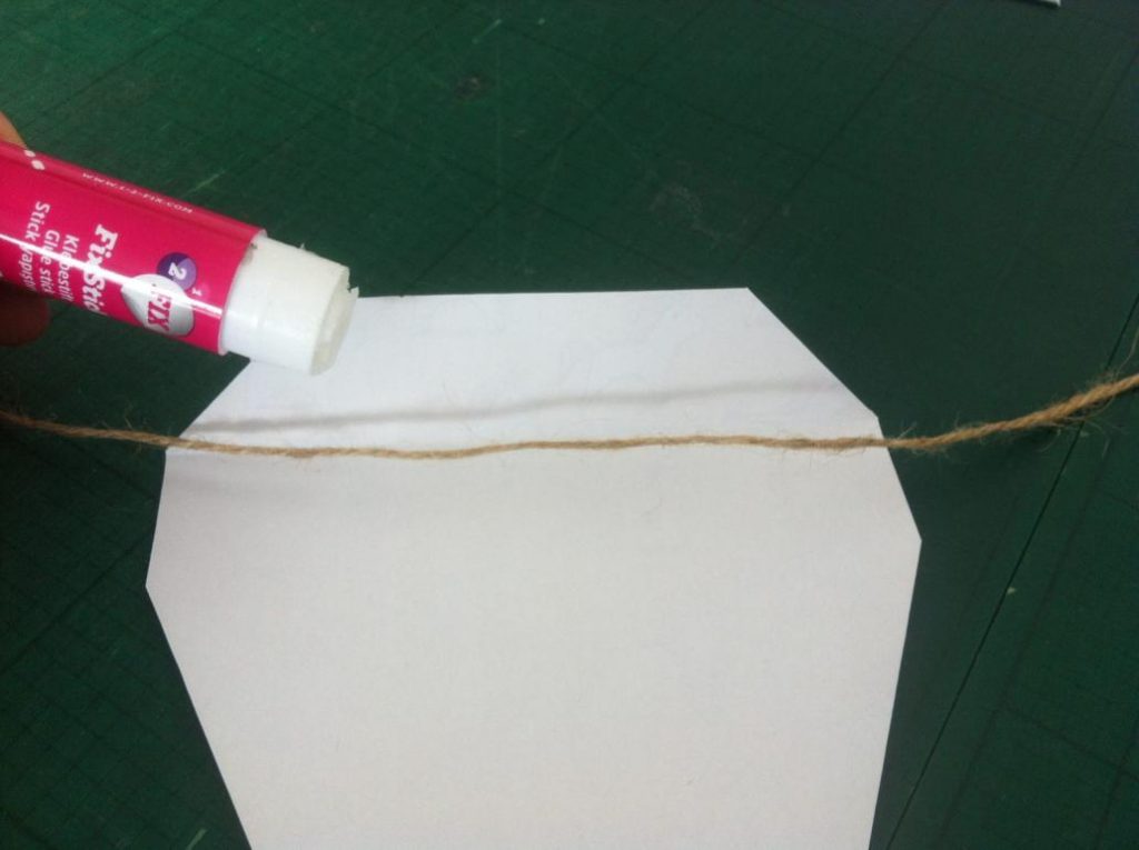 Die Fahnen sehen schon jetzt total klasse aus. Nun bringe ich die Einhorn-Fahnen an der Kordel an, indem ich sie mit Kleber befestigen. Ich beginne nun mit der ersten Fahne und lege die Kordel unter die Lasche und schmiere dann etwas Kleber darauf. Diese Lasche verschließe ich dann, sodass alles fest an der Kordel hängt.