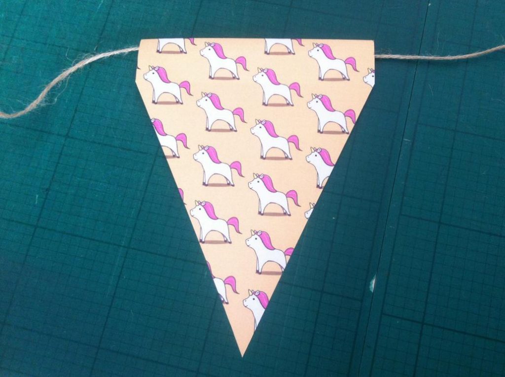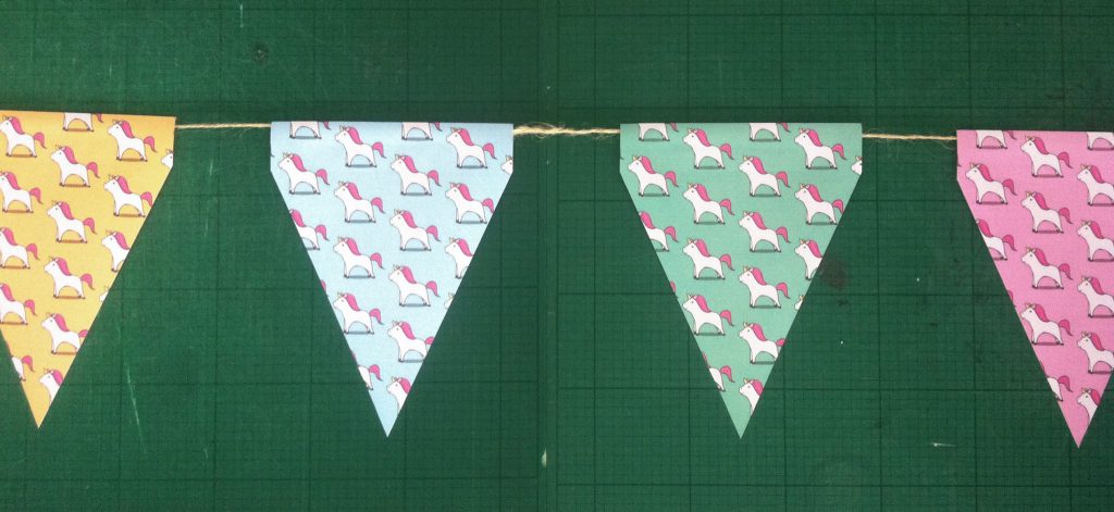 Das nächste Fähnchen bringe ich in einem kleinen Abstand daneben an. Dies mache ich dann für die restlichen Fahnen und habe am Ende eine wunderschöne Einhorn-Kette, die nun das Zimmer meiner Nichte schmücken kann. 😉