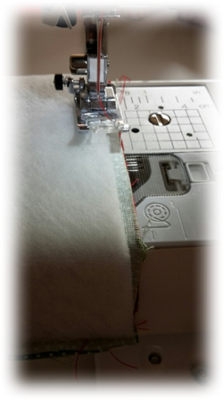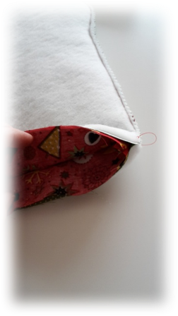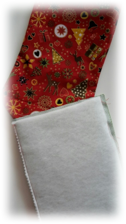 Ist das getan, bügelst du das Volumenvlies auf die Rückseite des Aussenstiefels. Hierbei solltest du beachten, dass die kleinen Klebepünktchen auf dem Vlies gegen die Stoffrückseite liegen und du über den Stoff bügelst und nicht auf dem Vlies!