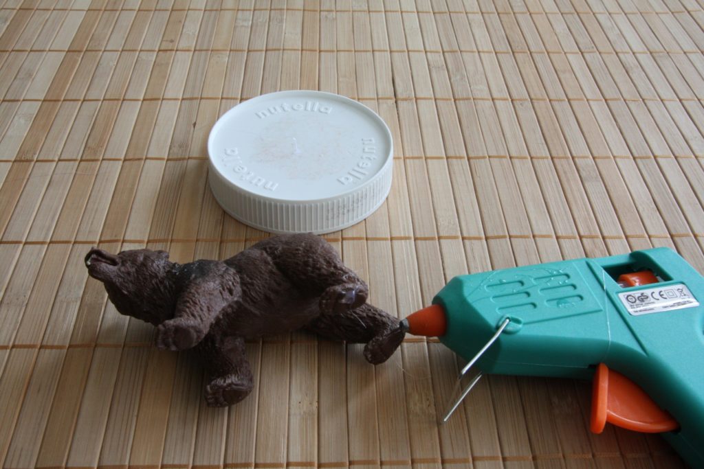 • Anschließend das Tier am Deckel festkleben, das geht am besten mit der Heißklebepistole