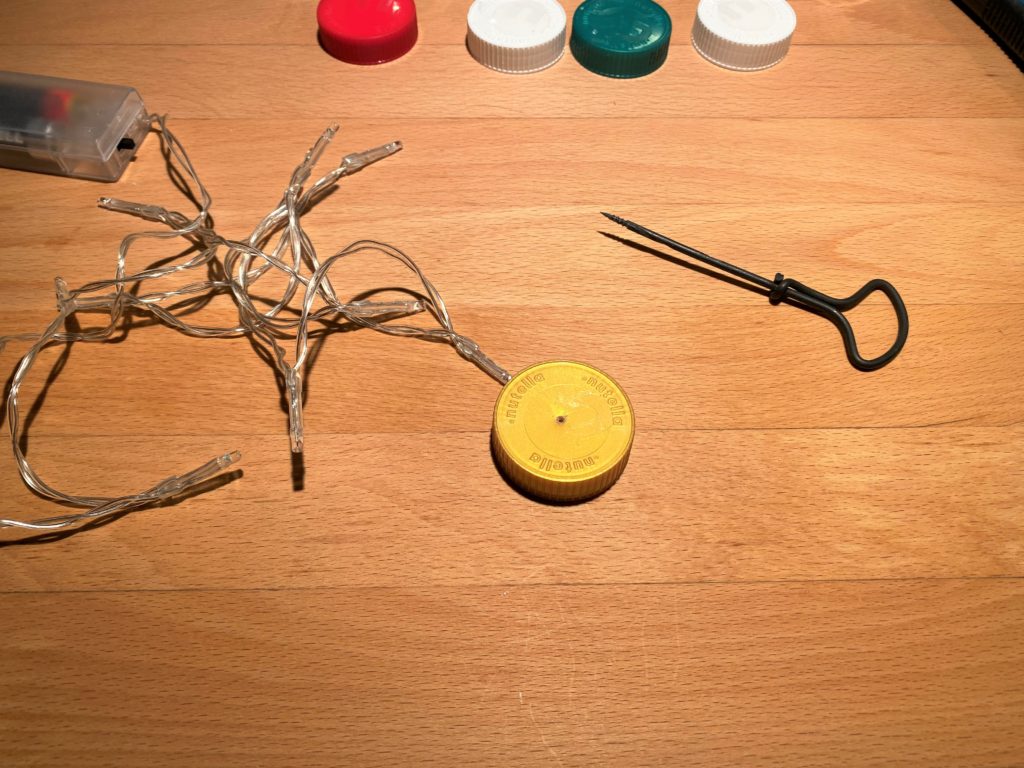 - Zuerst Bohrt ihr mit dem Handbohrer vorsichtig ein kleines Loch in die Mitte des Deckels und nehmt den Pappdeckel aus der weißen Schraubkappe heraus.