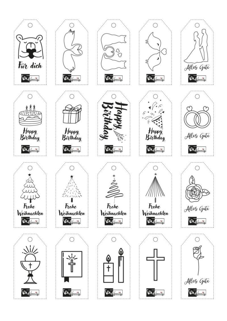 Ausschneiden und Verzieren: Nach dem Drucken kannst du die Anhänger mit einer Schere oder einem Motivlocher ausschneiden. Verziere sie anschließend mit Bändern, Stempeln oder anderen kleinen Dekoelementen, um ihnen eine persönliche Note zu verleihen.
