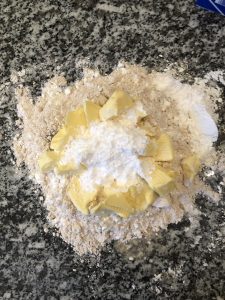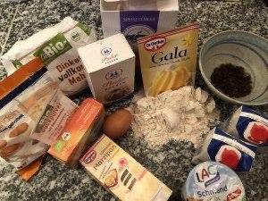 Für den Boden: 250g Mehl, 100g Zucker, 1 Ei, 1/2 Päckchen Backpulver, 150g Butter