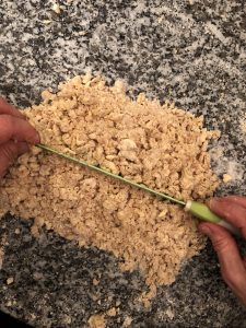 So, fangen wir an! Als allererstes müssen wir den leckeren Boden zubereiten. Dazu nimmst du alle Zutaten für den Boden und gibst sie auf eine saubere Arbeitsplatte. Stell sicher, dass du ausreichend Platz hast! Dann hab ich einen kleinen Trick für dich: Du nimmst ein scharfes Messer und bearbeitest die Masse, wie als würdest du Kräuter klein Hacken wollen. Immer wieder mit dem Messer in die Masse rein drücke. So bekommst du eine einheitliche Masse ohne Mixgerät oder anstrengende Handarbeit. 🙂 Auf dem Bild kannst du nochmal genau erkennen, was ich damit meine!