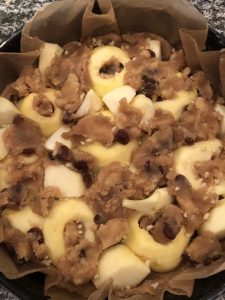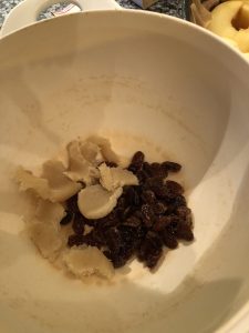 Wenn dein Boden jetzt schön gekühlt ist, legst du deine Äpfel hinein, gibst die Rosinen dazu, genau wie die gehackten Mandeln und das Marzipan.